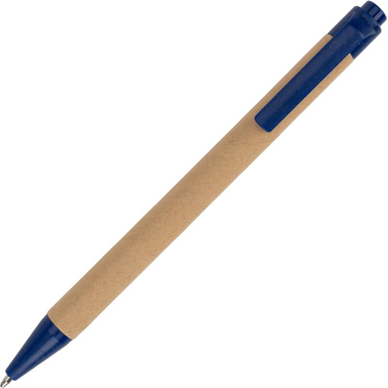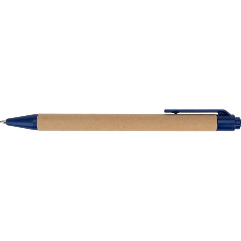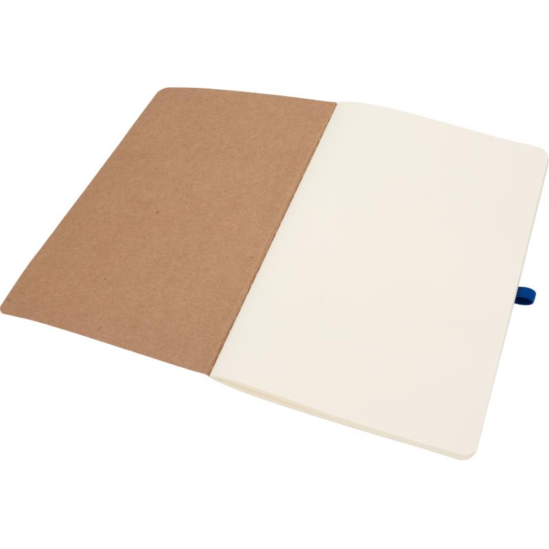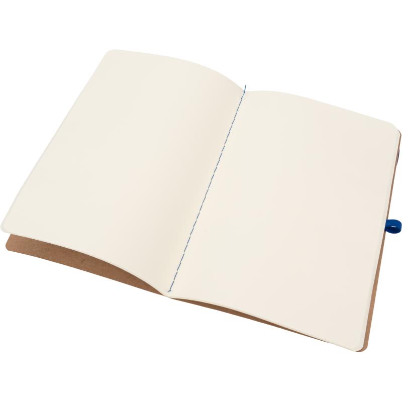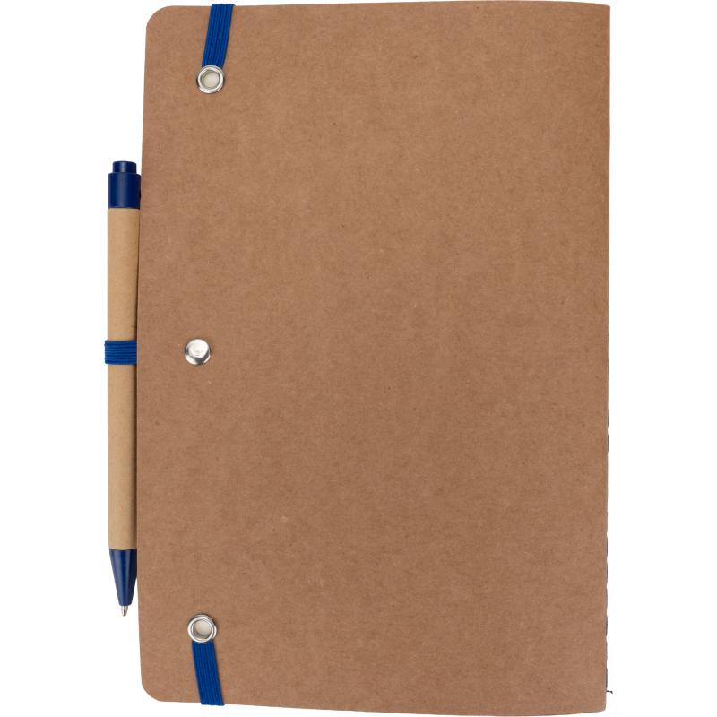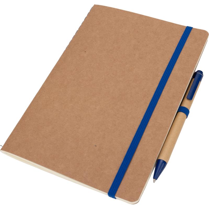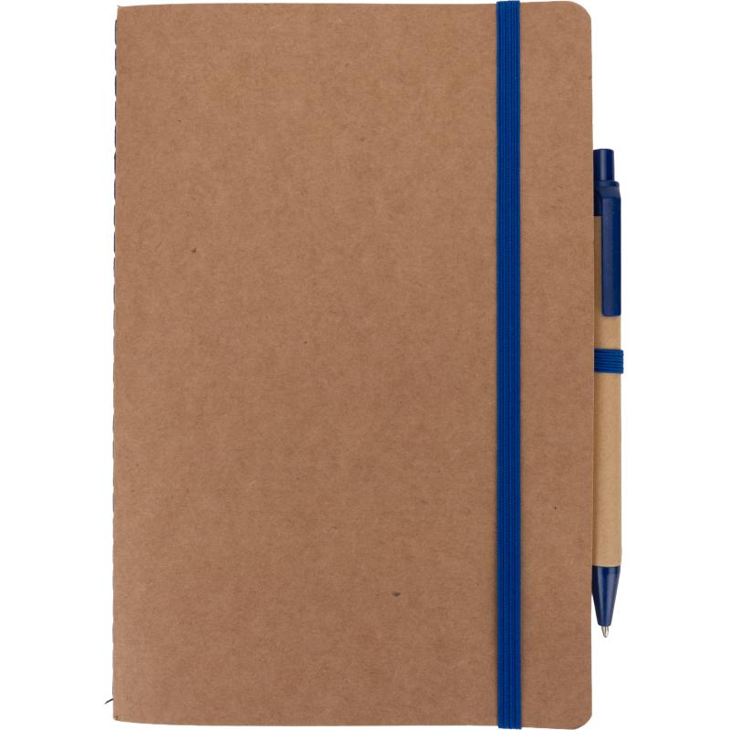 Notes o formacie A5, wykonany z papieru pochodzącego z recyklingu, posiada 120 czystych stron, zamknięcie na gumkę i długopis z niebieskim wkładem.