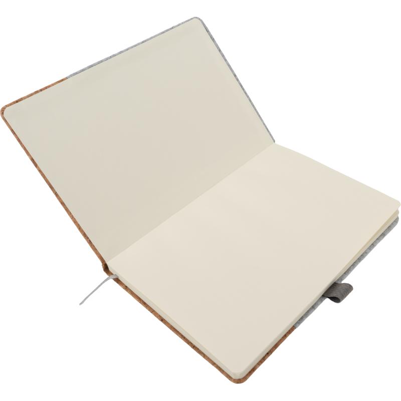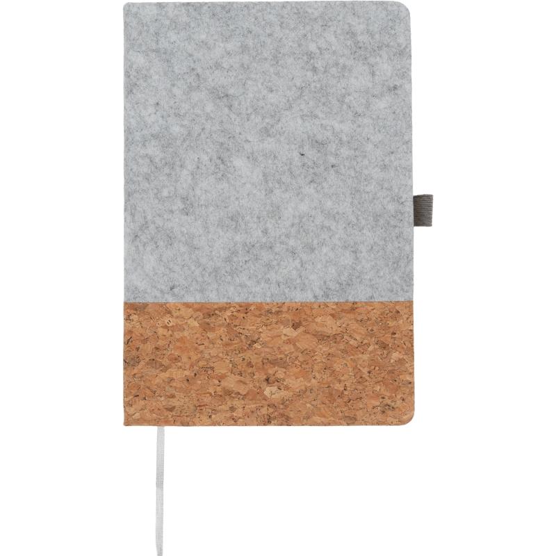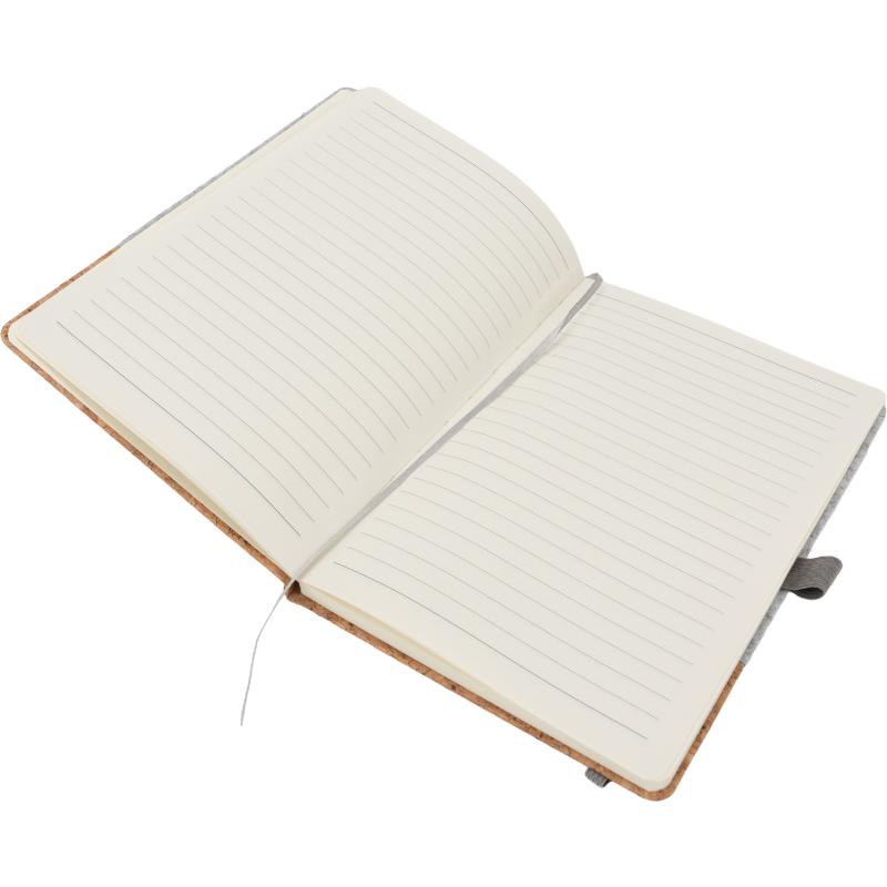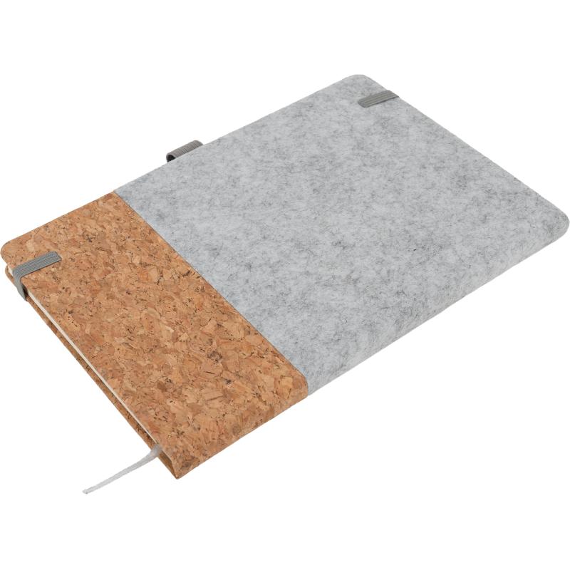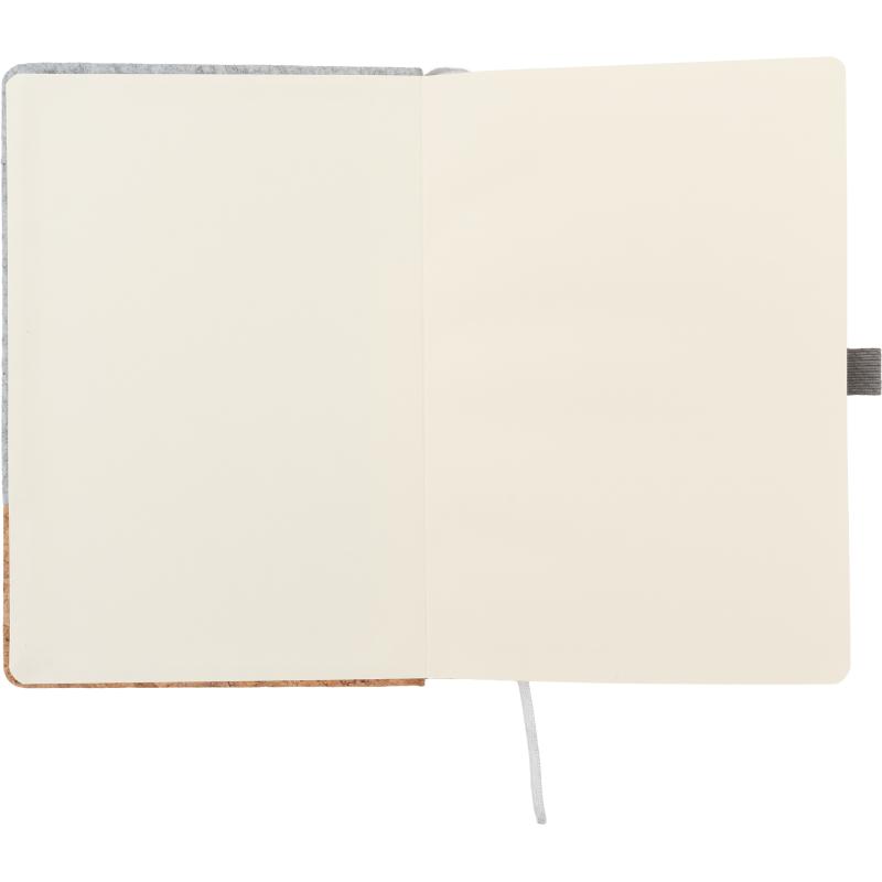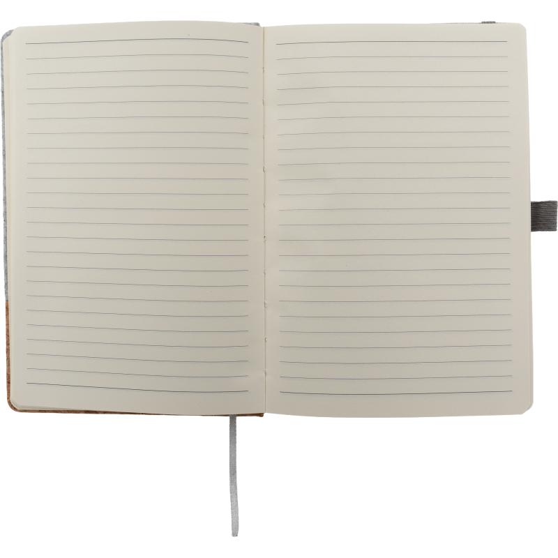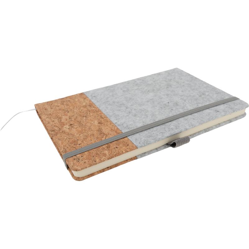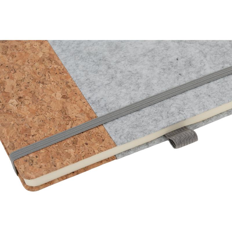 Notes A5 w oprawie z filcu i korka pochodzących z recyklingu, z gumką do zamykania i pętelką na długopis. Notes posiada 80 kartek w linie.