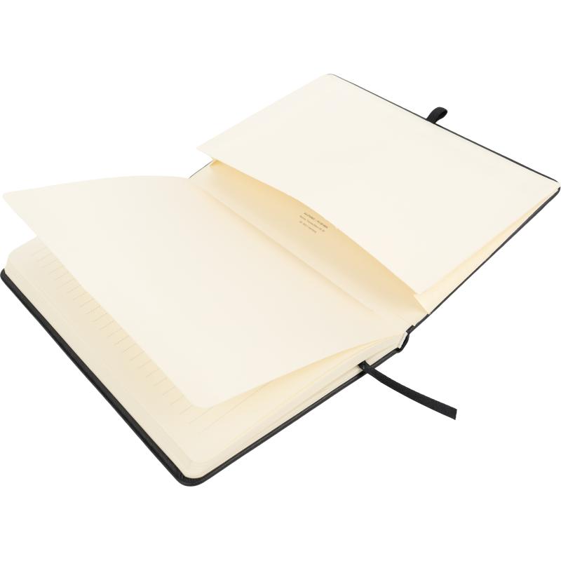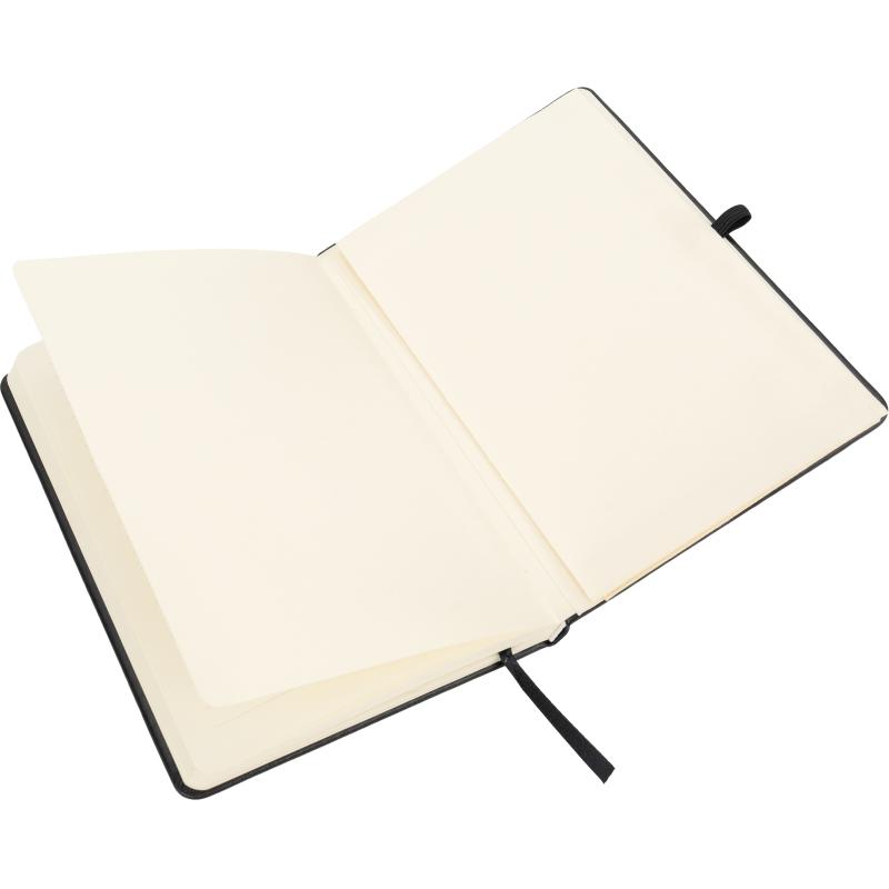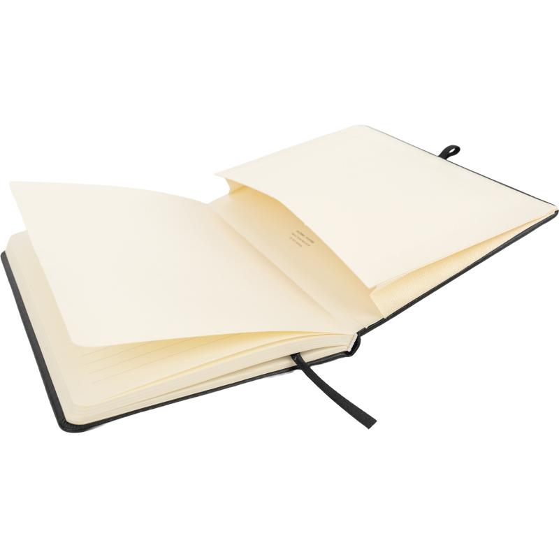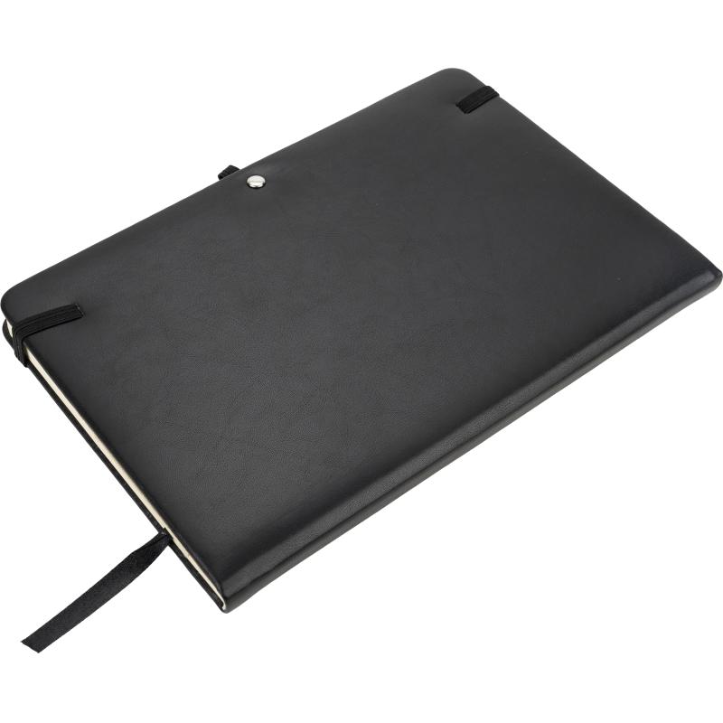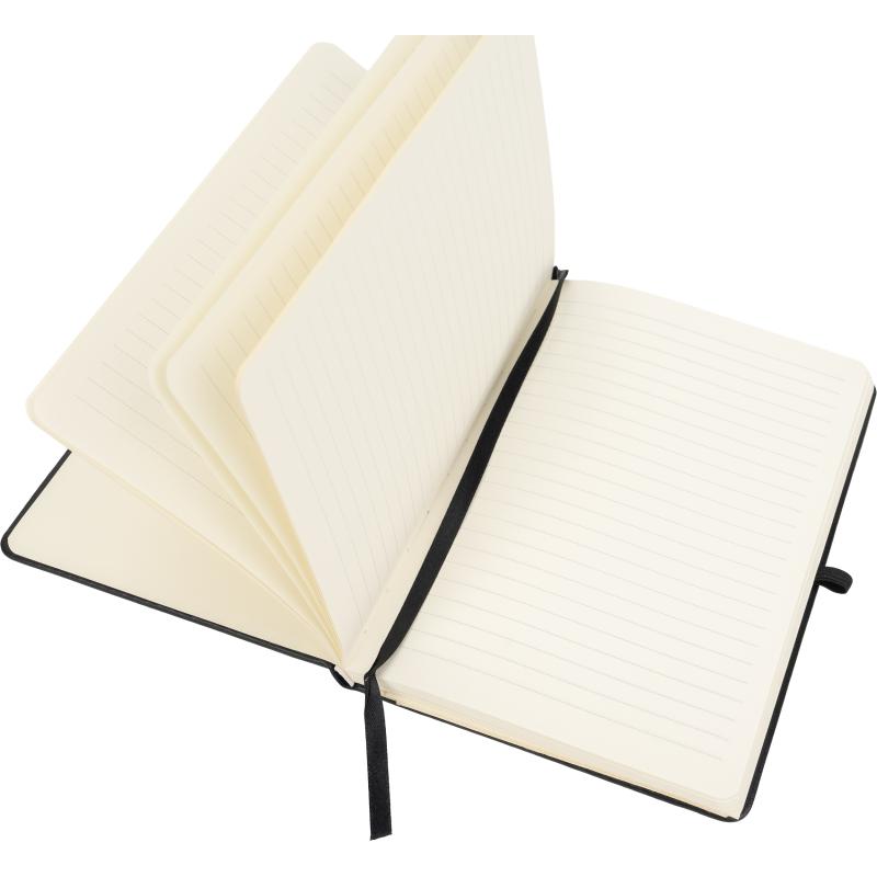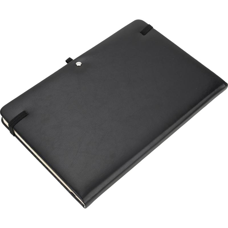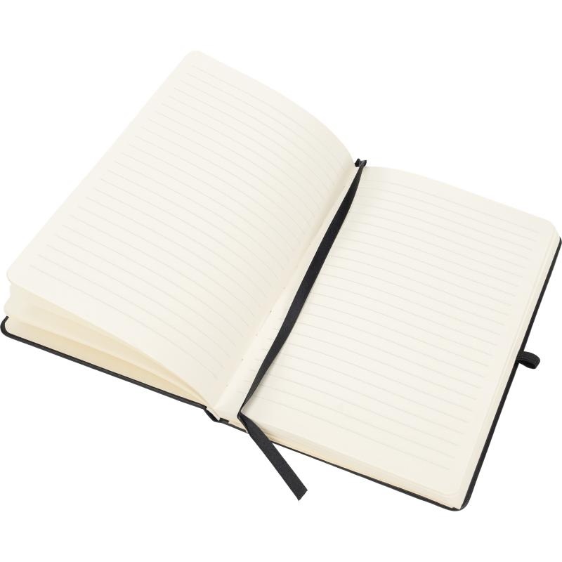 Notatnik A5 z okładką z imitacji skóry, 80 kartkami w linie, zakładką, miejscem na długopis i kieszonką na wewnętrznej stronie okładki. Zamykany elastyczną taśmą.