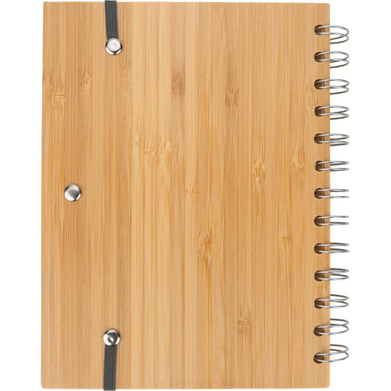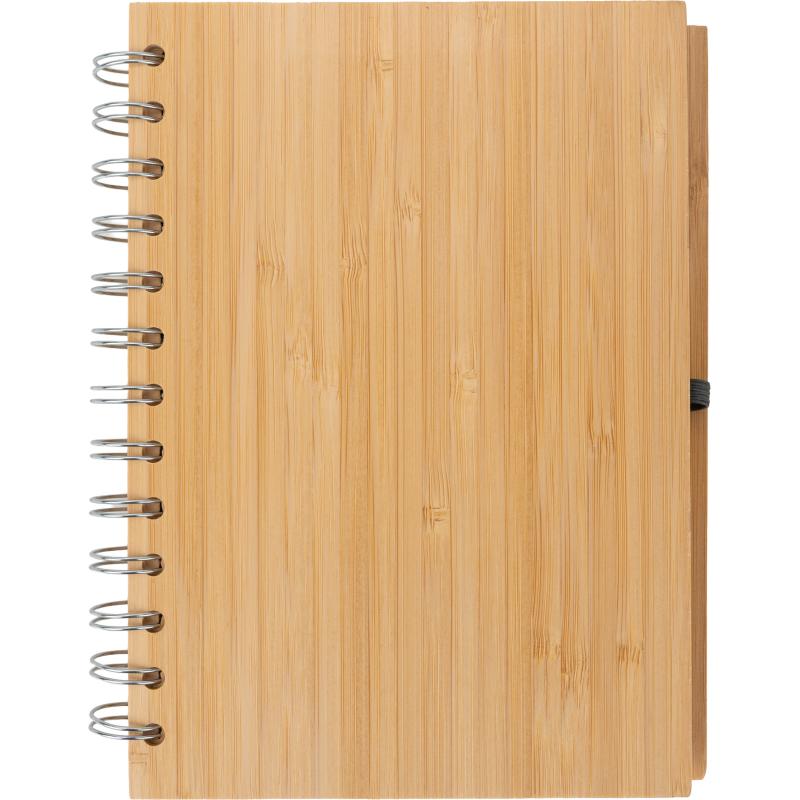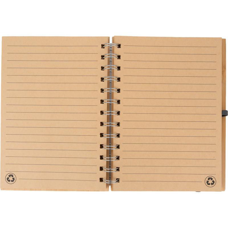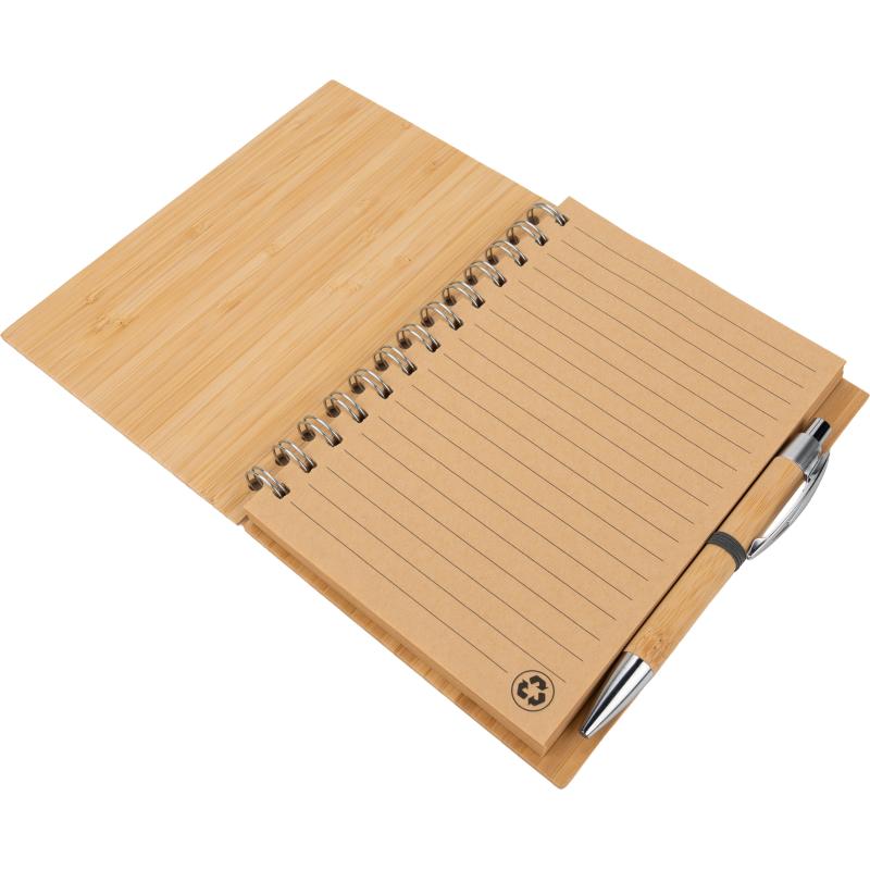 Notes A5 w okładce z bambusa. Zawiera 140 stron z niebielonego papieru w linie pochodzącego z recyklingu, a także bambusowy długopis z niebieskim wkładem.