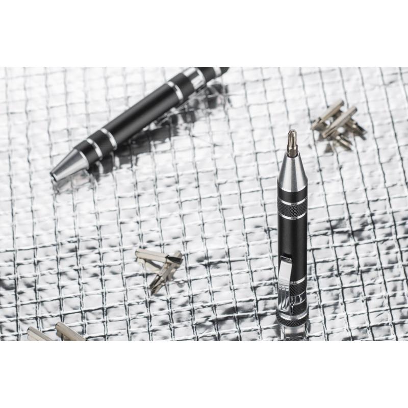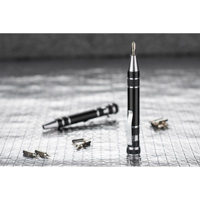 Komplet śrubokrętów zawiera 8 różnych końcówek. Klip umożliwia przymocowanie do kieszeni dzięki czemu zapobiegnie przypadkowemu zgubieniu. Końcówki śrubkrętów mocowane za pomocą magnesu.