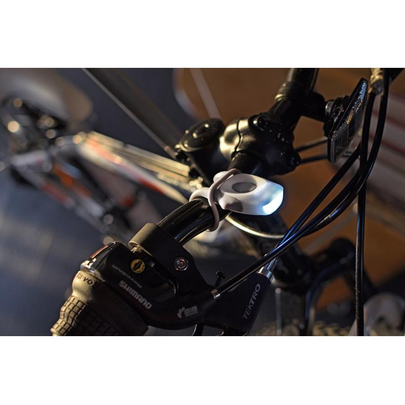 Praktyczna lampka rowerowa z dwoma diodami LED oraz silikonowym mocowaniem do roweru. Lampka przednia - posiada białe diody.