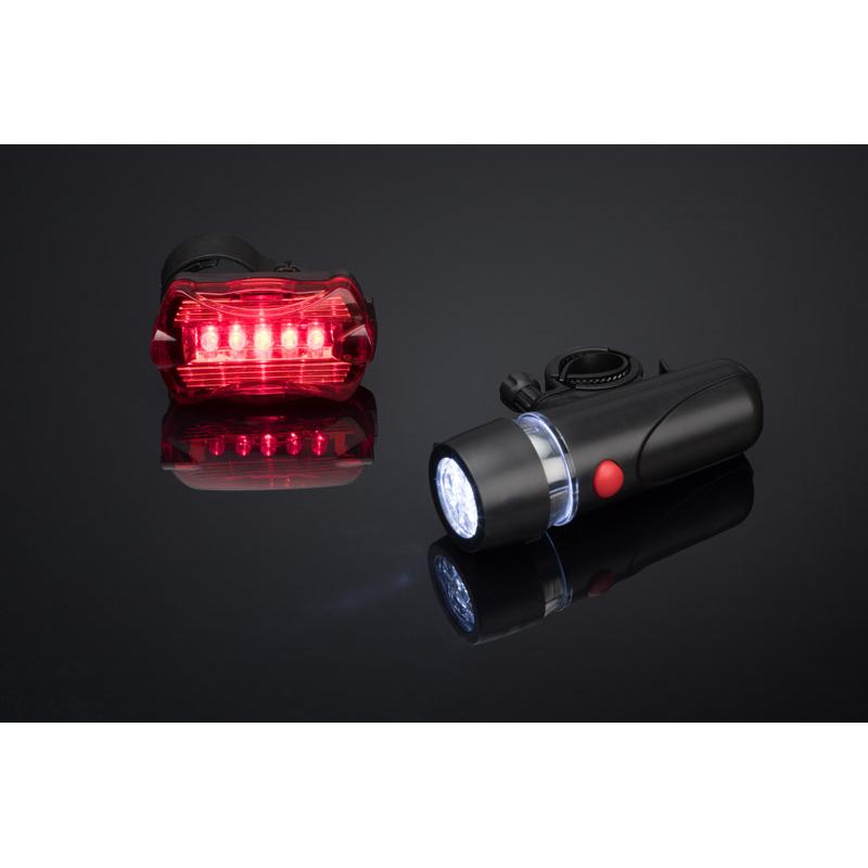 AZER to zestaw lampek rowerowych o ekonomicznym źródle światła LED. Mocne światło przednie i zapewniające widoczność z kilkuset metrów światło tylne sprawią, że bez obaw będziesz jeździć o każdej porze dnia i nocy. Charakteryzują się bardzo łatwym montażem. Lampka przednia posiada 5 białych diod LED i 3 tryby świecenia: jeden ciągły i dwa migające. Natomiast lampka tylna posiada 5 czerwonych diod LED i 7 trybów świecenia: jeden ciągły i 6 migających.