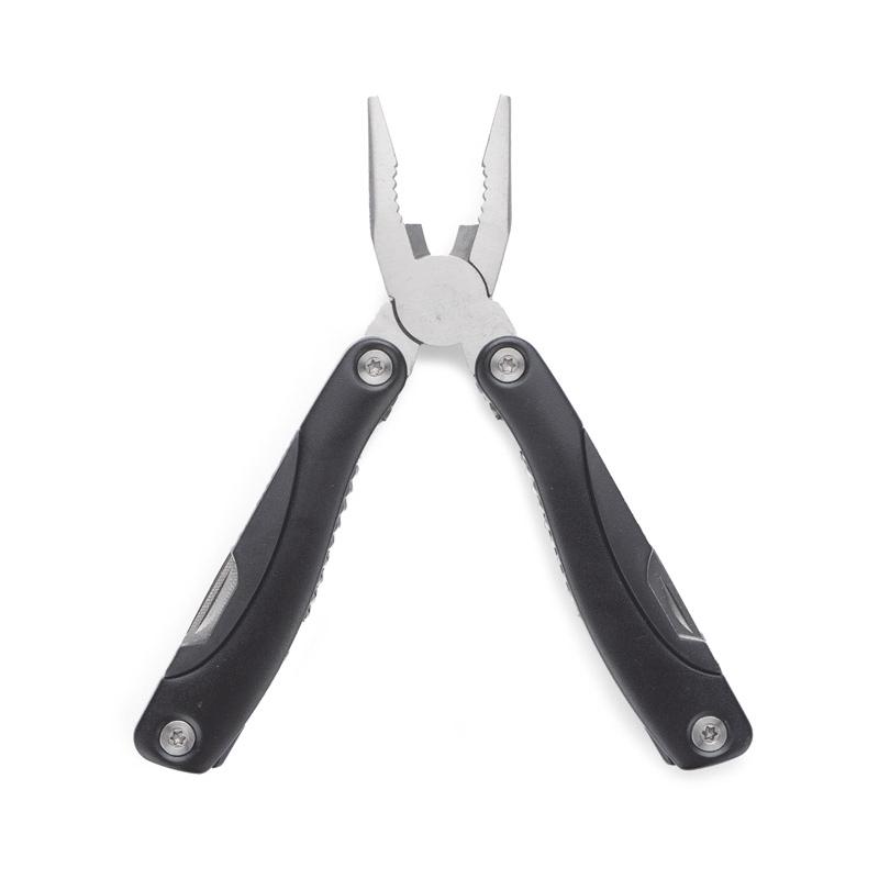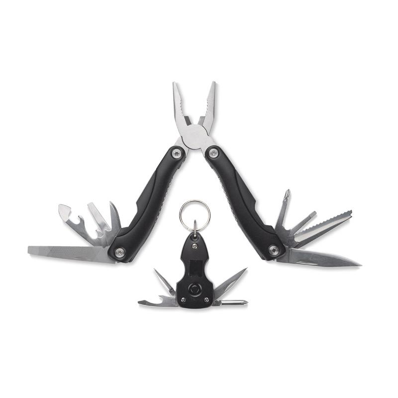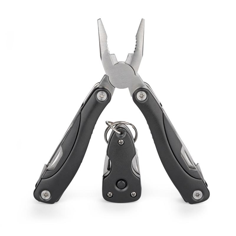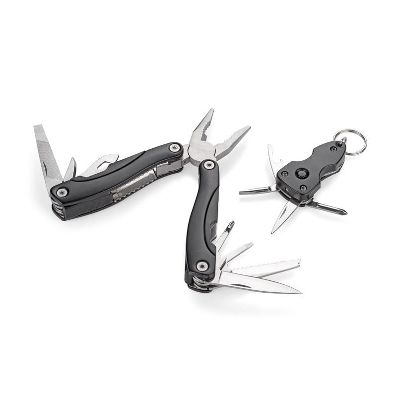 TOOL to zestaw składający się z narzędzia wielofunkcyjnego i breloka narzędziowego. Funkcje narzędzia: kombinerki, przecinak, nóż o gładkim ostrzu, piła, śrubokręt płaski i krzyżowy, pilnik, otwieracz do puszek i butelek. Wyposażony w blokadę wszystkich elementów. Funkcje breloka: nóż, śrubokręt płaski i krzyżowy, otwieracz do butelek, latarka. Oba gadżety zapakowane zostały w ekologiczne, kartonowe pudełko. Wymiary narzędzia wielofunkcyjnego 158 x 68 x 23 m, wymiary breloka 30 x 60 x 18 mm