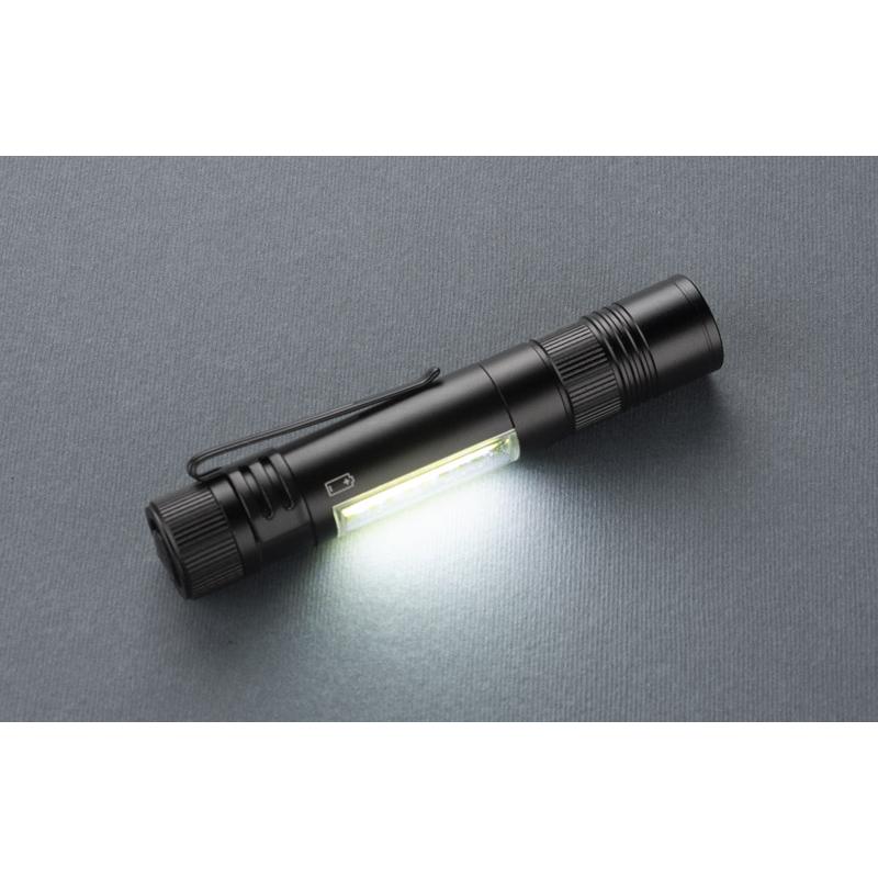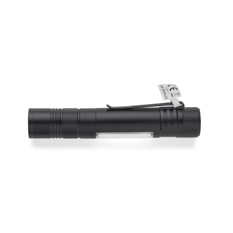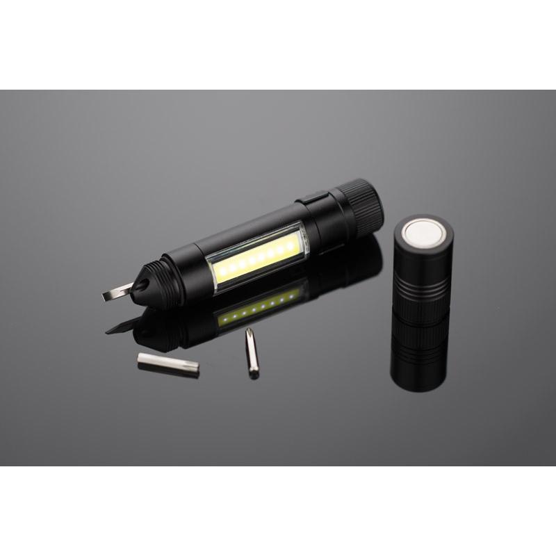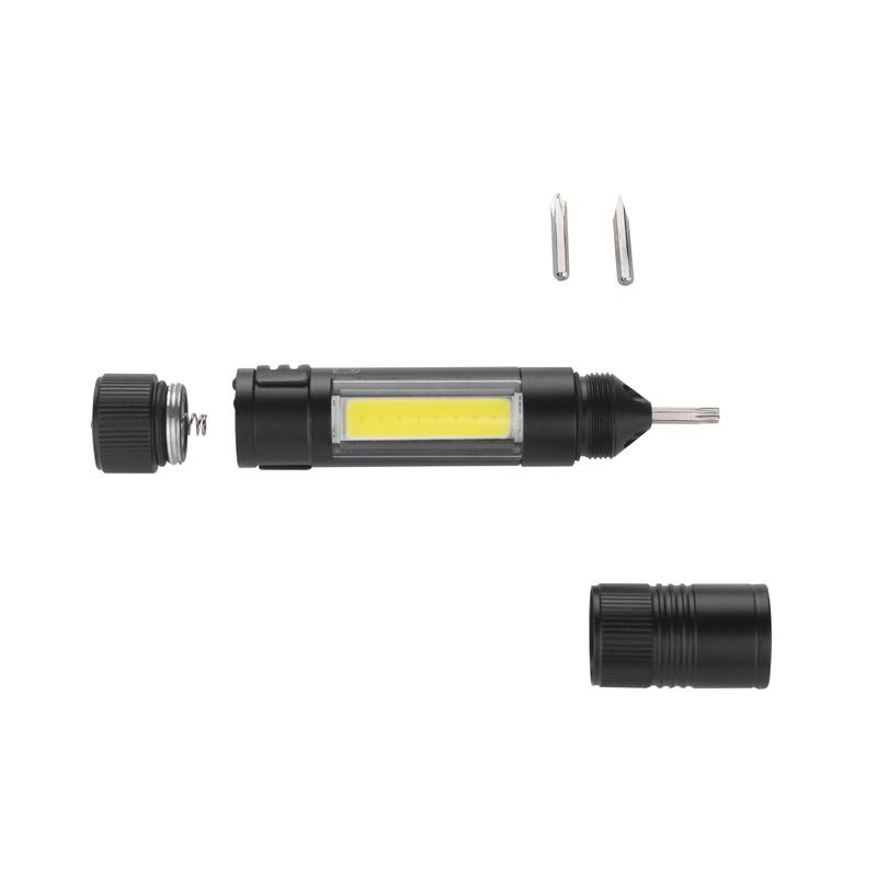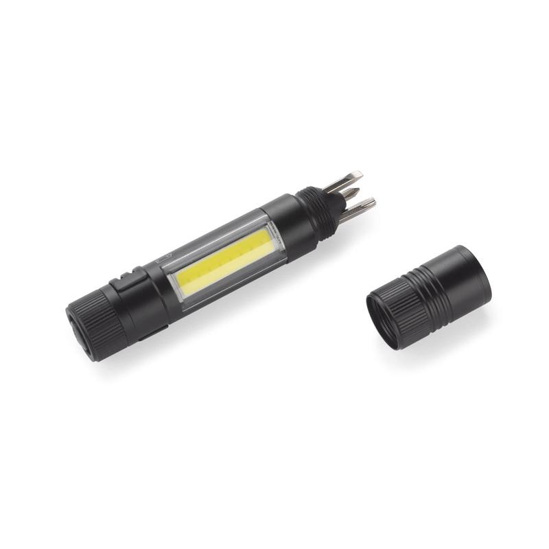 Latarka MAESTRO to gadżet wielofunkcyjny. Oprócz głównej funkcji, czyli lampki COB, w produkcie znajdziemy również zestaw trzech bitów: płaski, krzyżowy i gwiazdkowy. Latarka wyposażona jest w metalowy klip i magnes do mocowania.
