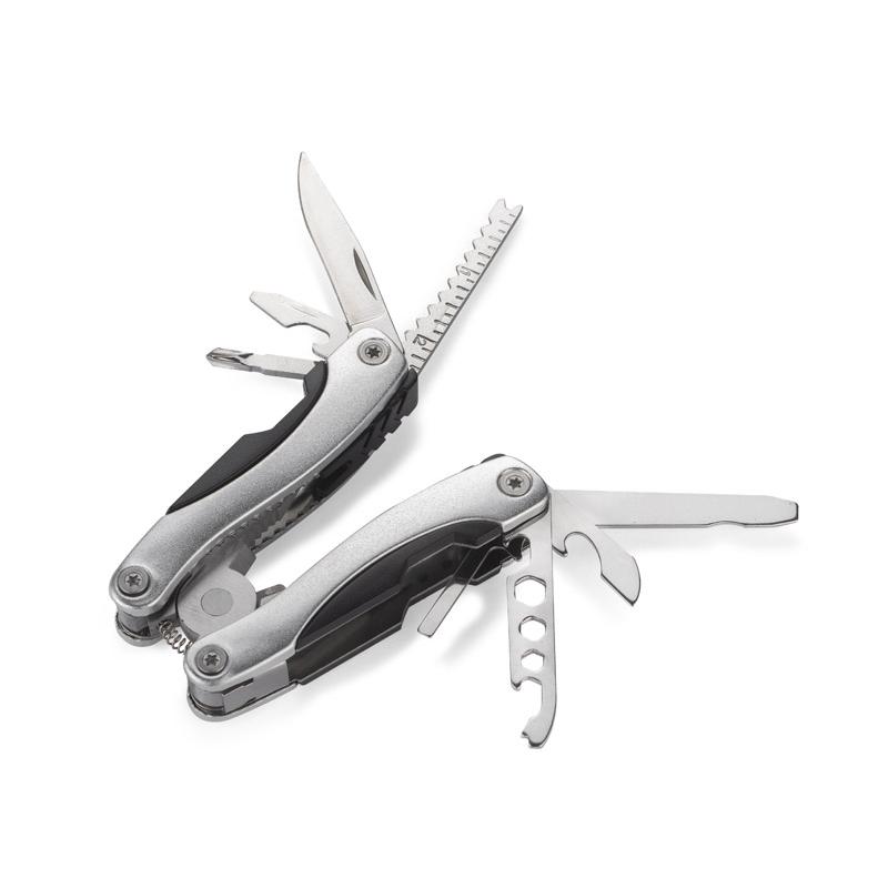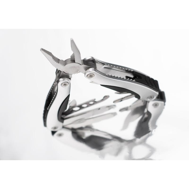 Narzędzie WORK to bardzo dobry wybór wśród kieszonkowych narzędzi wielofunkcyjnych. Posiada następujące funkcje: kombinerki, przecinak, nóż o gładkim ostrzu, piła, pilnik, śrubokręt płaski i krzyżowy, otwieracz do butelek i puszek oraz trzy rozmiary kluczy oczkowych. W komplecie znajduje się również czarny pokrowiec na narzędzie wykonany z tkaniny Oxford.