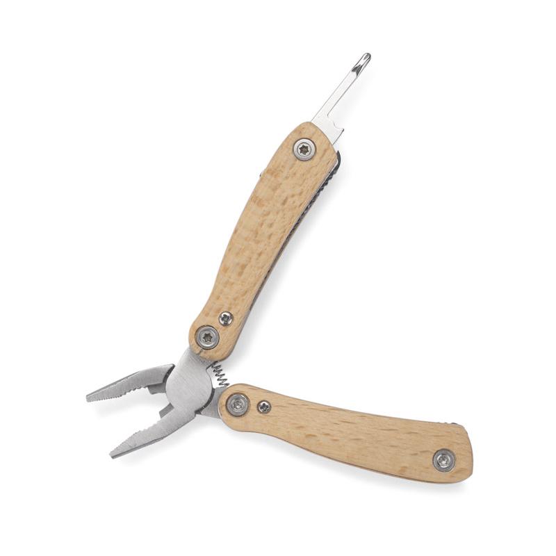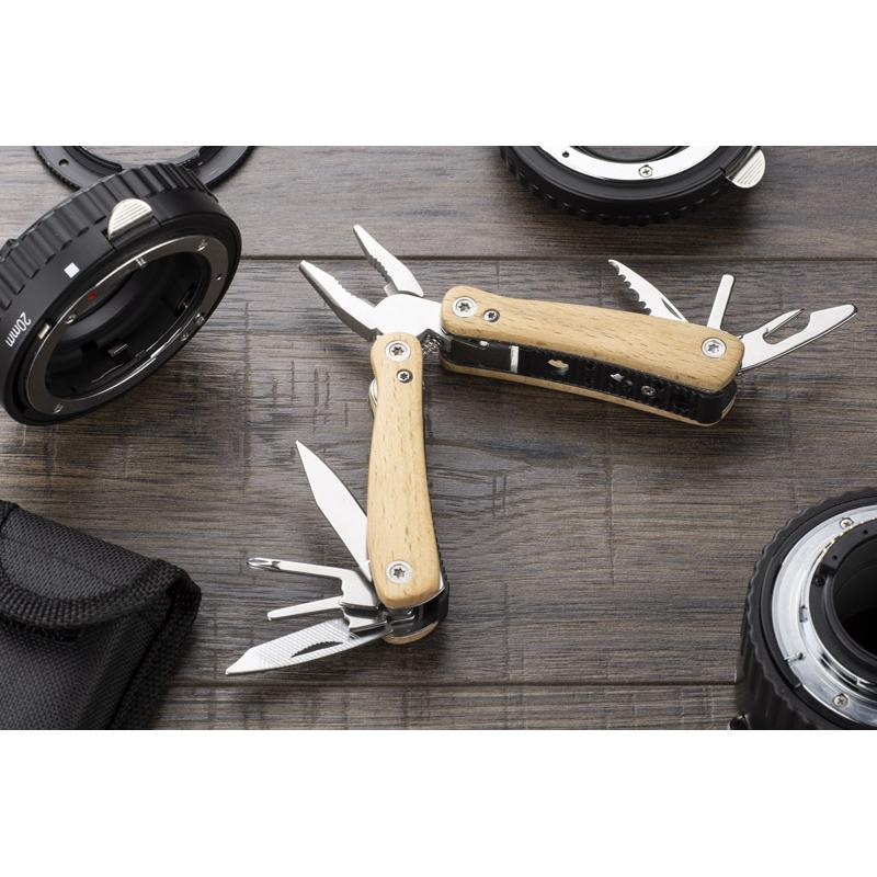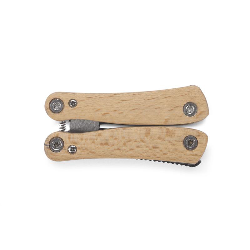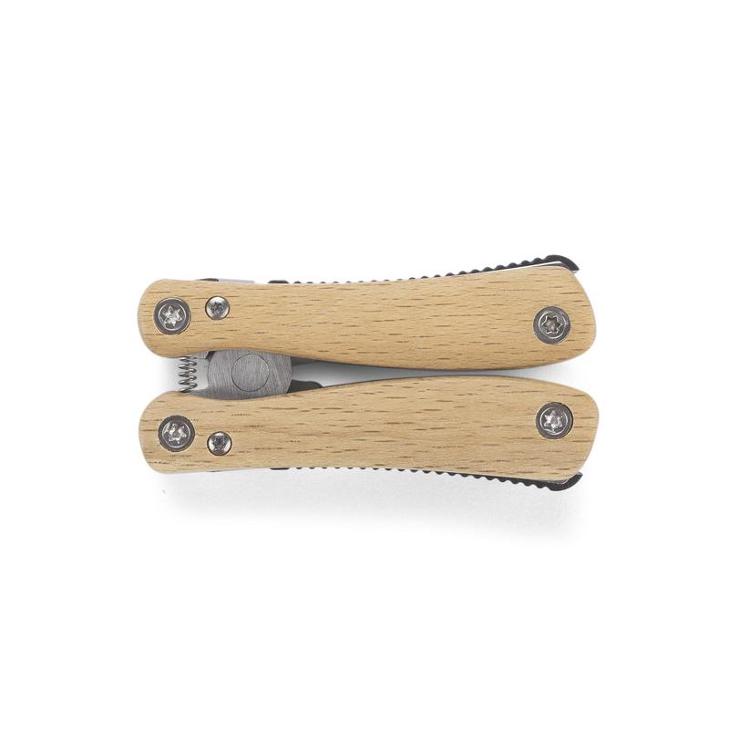 Narzędzie wielofunkcyjne FORT to gadżet w kieszonkowym rozmiarze, wykończony drewnem. Funkcje: kombinerki, przecinak, nóż, śrubokręt płaski i krzyżowy, pilnik, piła, otwieracz do butelek i puszek. W komplecie znajduje się również czarny, materiałowy pokrowiec na narzędzie.