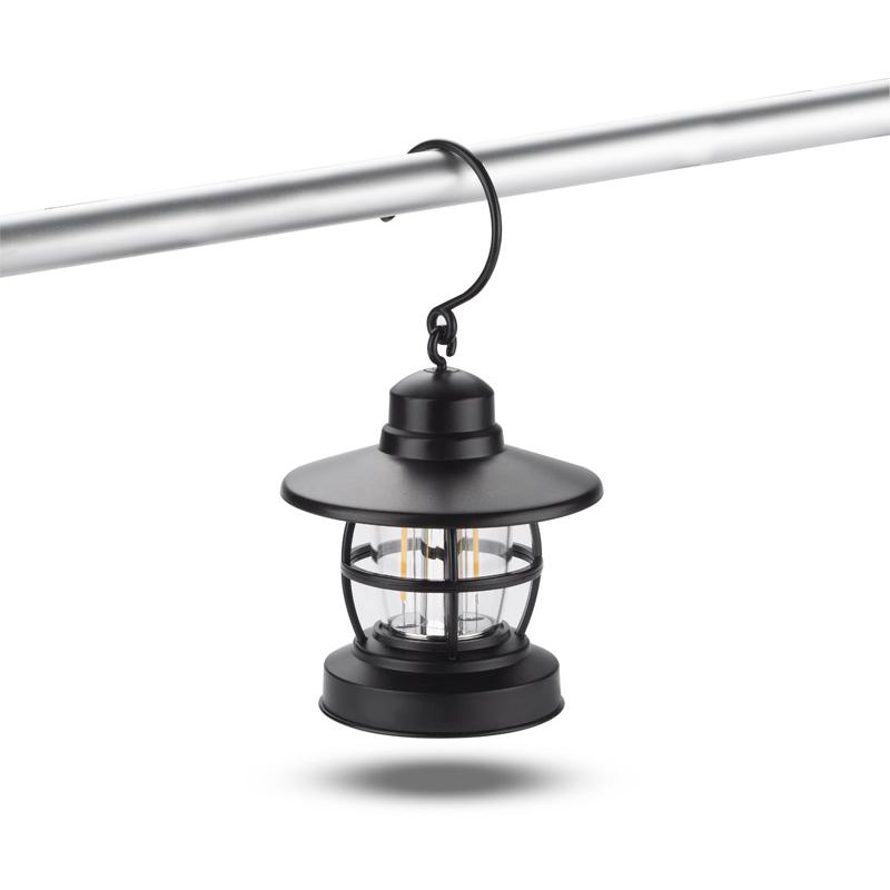 Przenośna lampka CAMPE z diodami typu COB. Duży haczyk pozwala na wygodne powieszenie. Zasilanie bateriami: 3 x AAA.