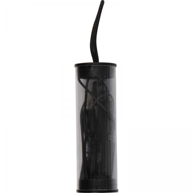 Plastikowe słuchawki bezprzewodowe (Bluetooth) z regulacją głośności i kablem z portem USB do ładowania. Całość umieszczona w plastikowym opakowaniu ze sznurkiem.