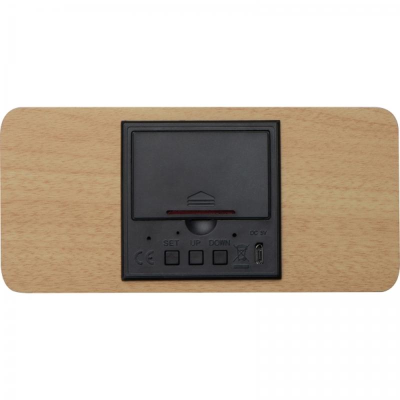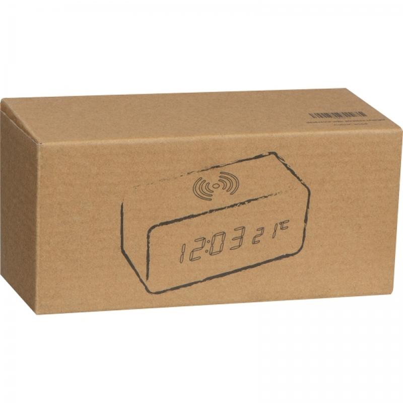 Zegar na biurko wykonany z drewna i plastiku, z termometrem i bezprzewodową ładowarką.