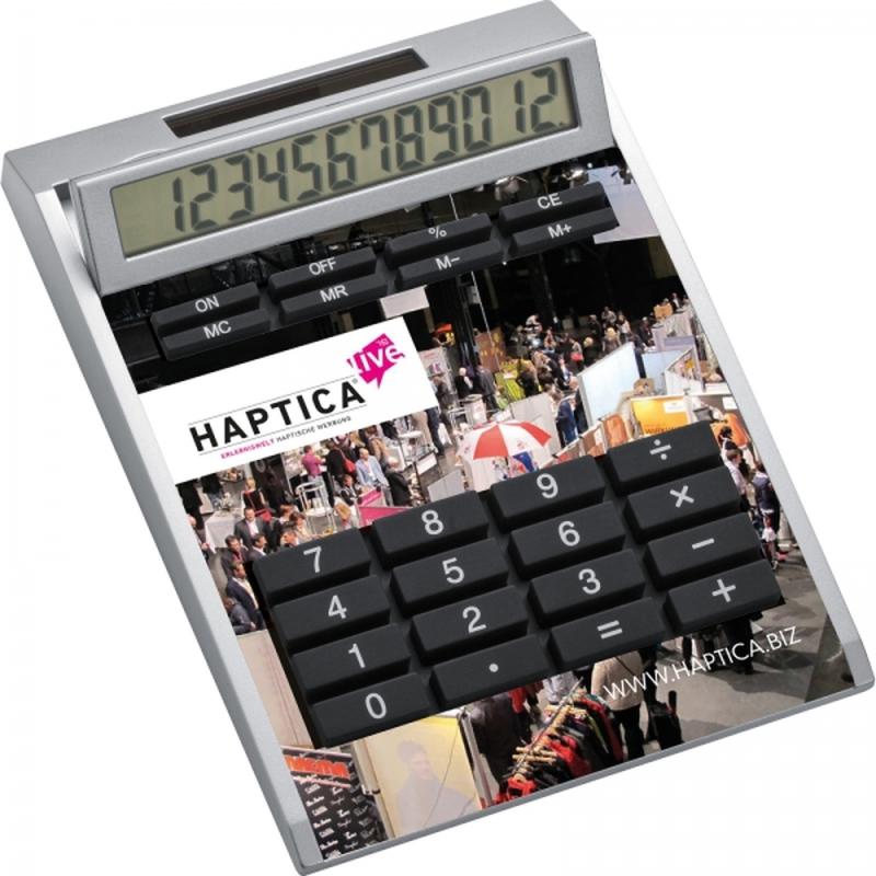 Niepowtarzalny kalkulator z kolekcji CrisMa z 12 cyfrowym wyświetlaczem, wykonany z plastiku w kolorze srebrnym. Posiada nietypową nakładkę w kolorze białym, która może zostać w całości nadrukowana. Zasilanie solarne i na baterię.
