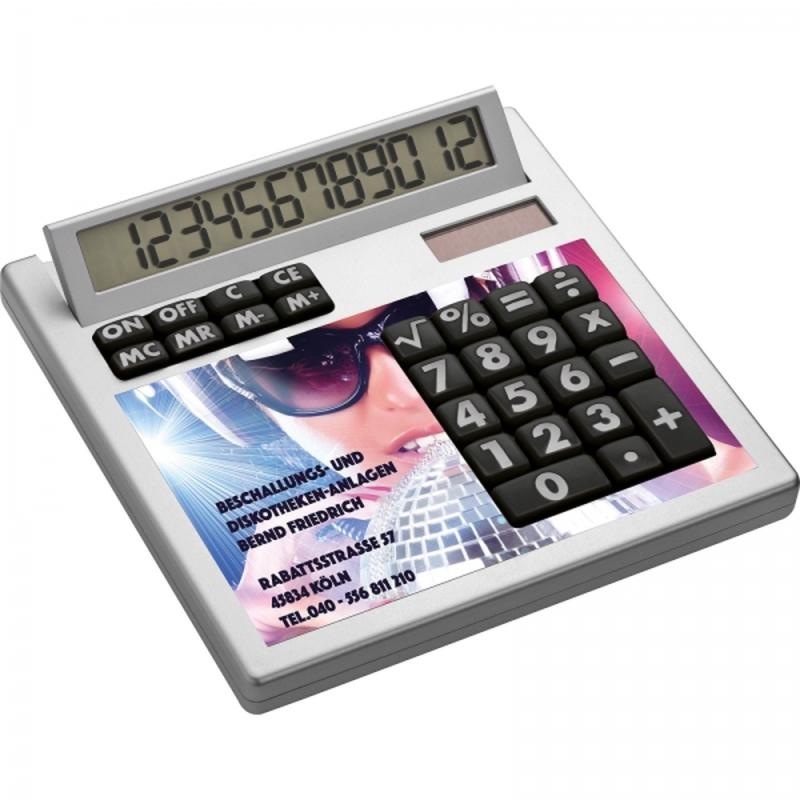Niepowtarzalny kalkulator z kolekcji CrisMa z 12 cyfrowym wyświetlaczem, wykonany z plastiku w kolorze srebrnym. Posiada nietypową nakładkę w kolorze białym, która może zostać w całości nadrukowana. Zasilanie solarne i na baterię.