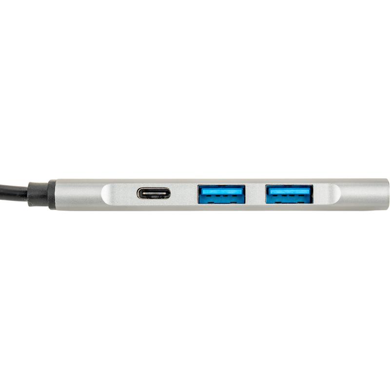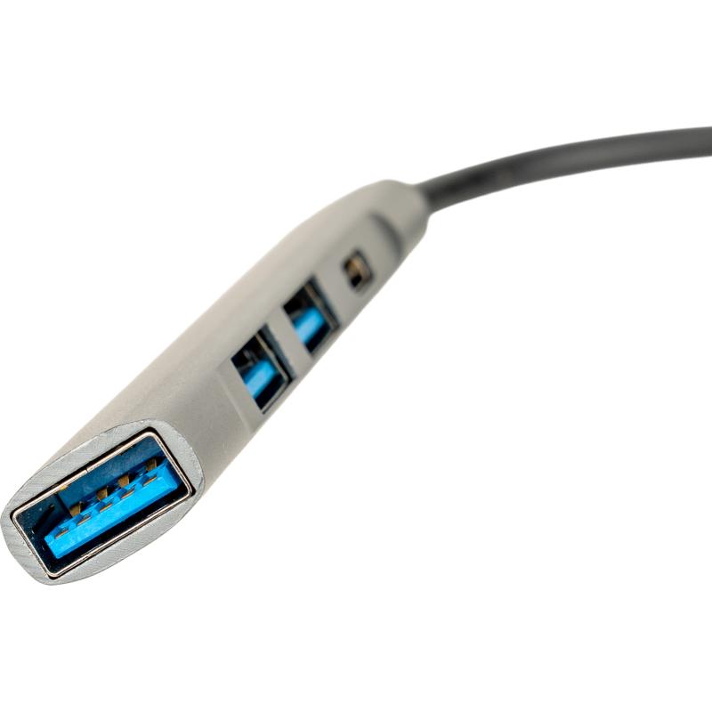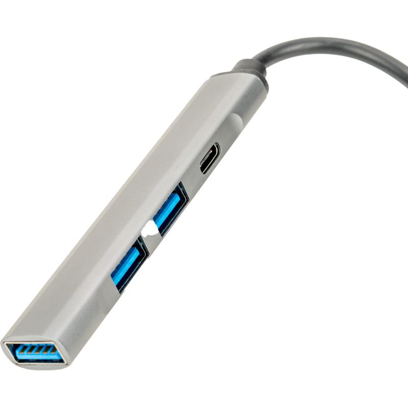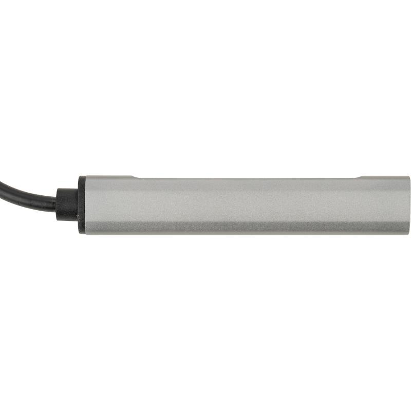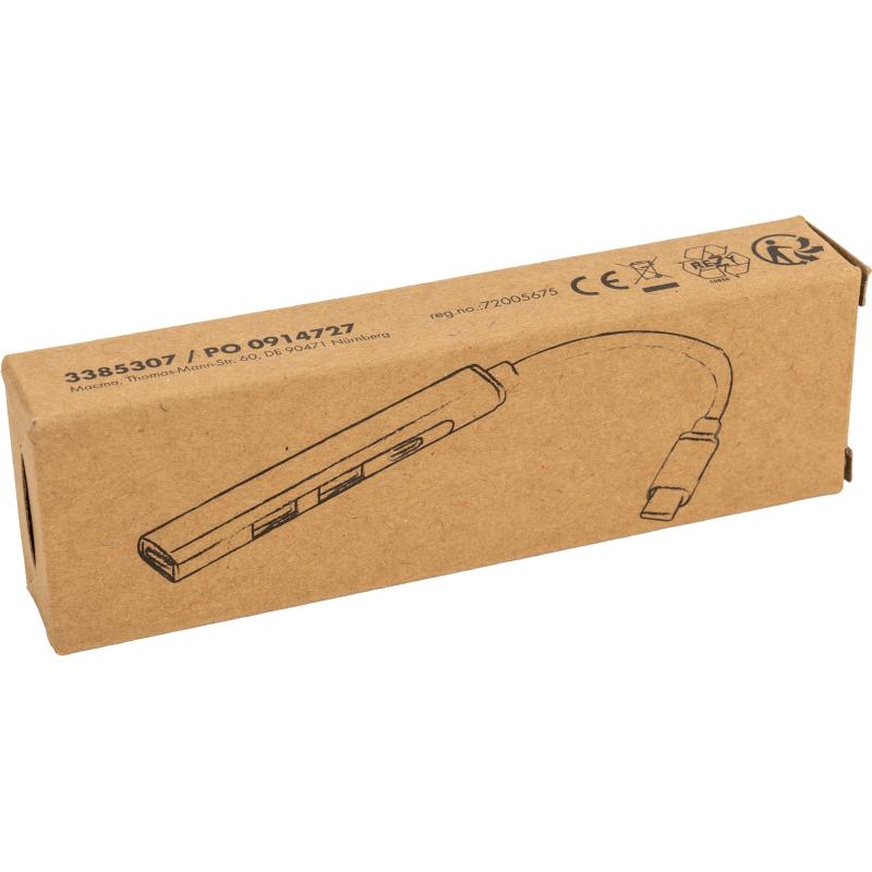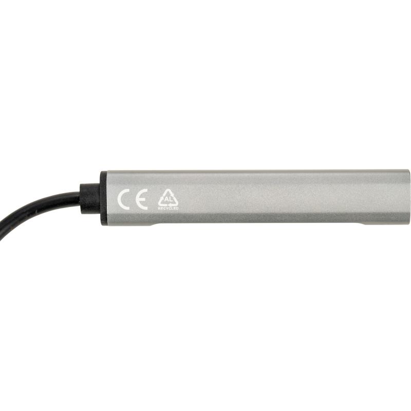 Rozgałęźnik HUB z funkcją transferu danych, wykonany z aluminium pochodzącego z recyklingu, z 3 wejściami USB, USB typu C oraz kablem na USB typu C. Moc wejściowa: 5.0V 500mA, moc wyjściowa: 5.0V 500mA
