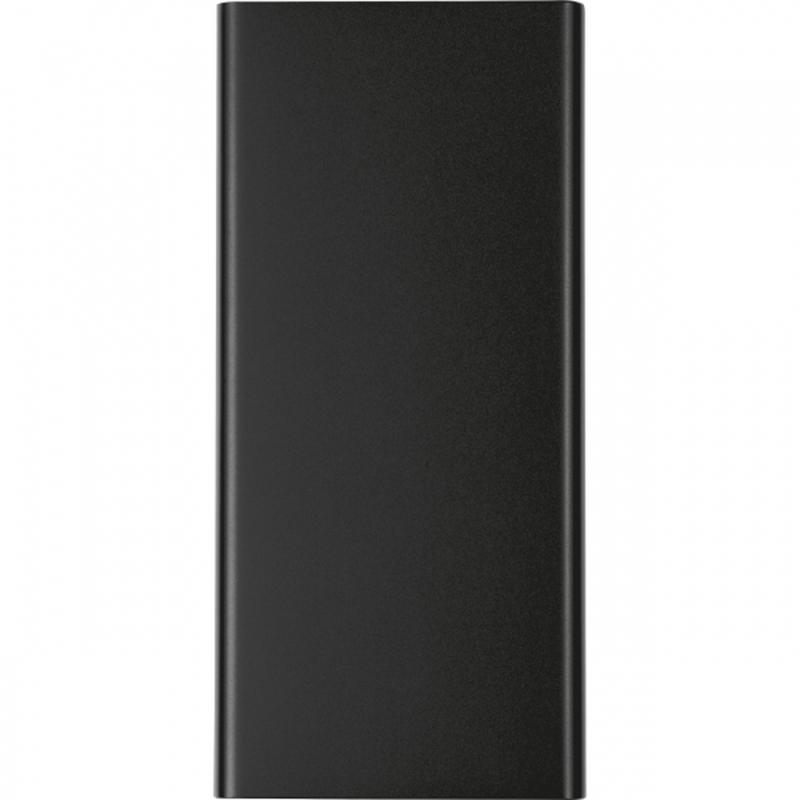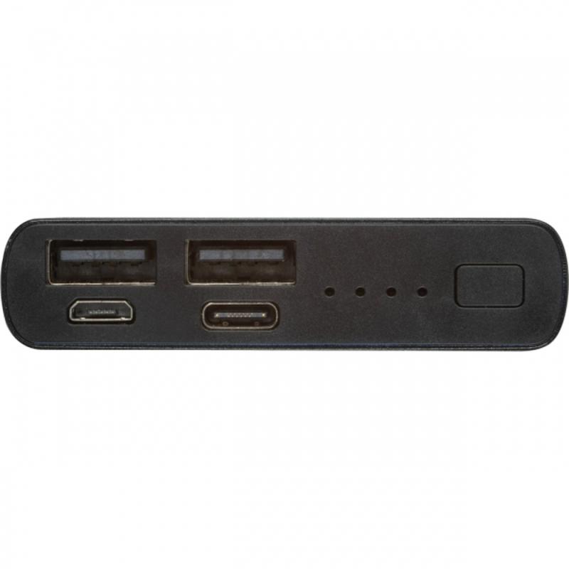 Power bank z aluminium pochodzącego z recyklingu, o pojemności 10 000 mAh, z wyświetlaczem LCD i kabelkiem do ładowania. Power bank posiada 2 porty USB i wejście typu C.