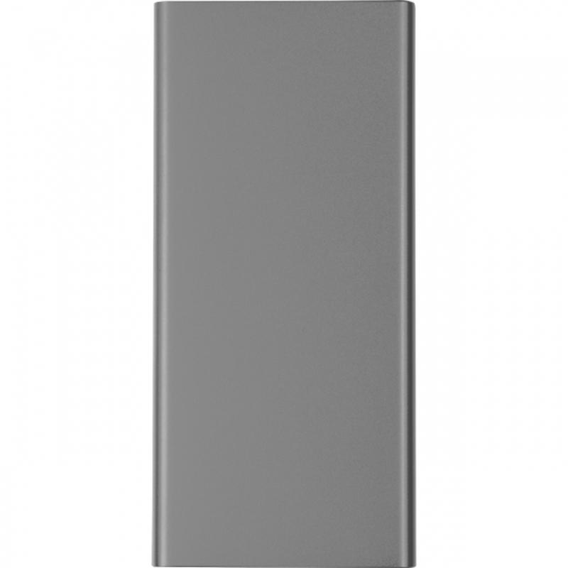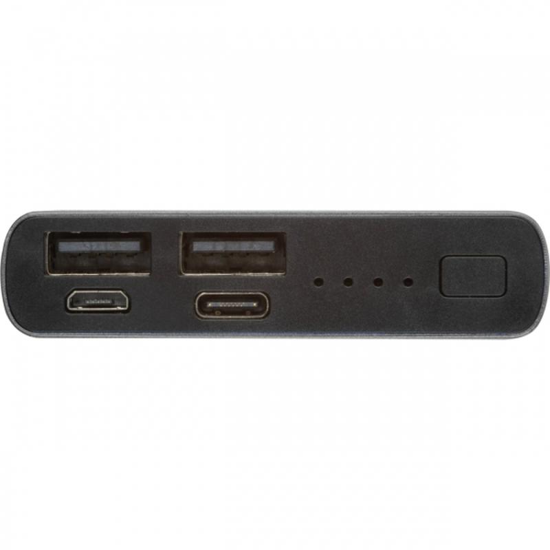 Power bank z aluminium pochodzącego z recyklingu, o pojemności 10 000 mAh, z wyświetlaczem LCD i kabelkiem do ładowania. Power bank posiada 2 porty USB i wejście typu C.