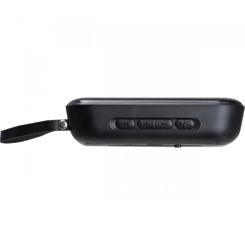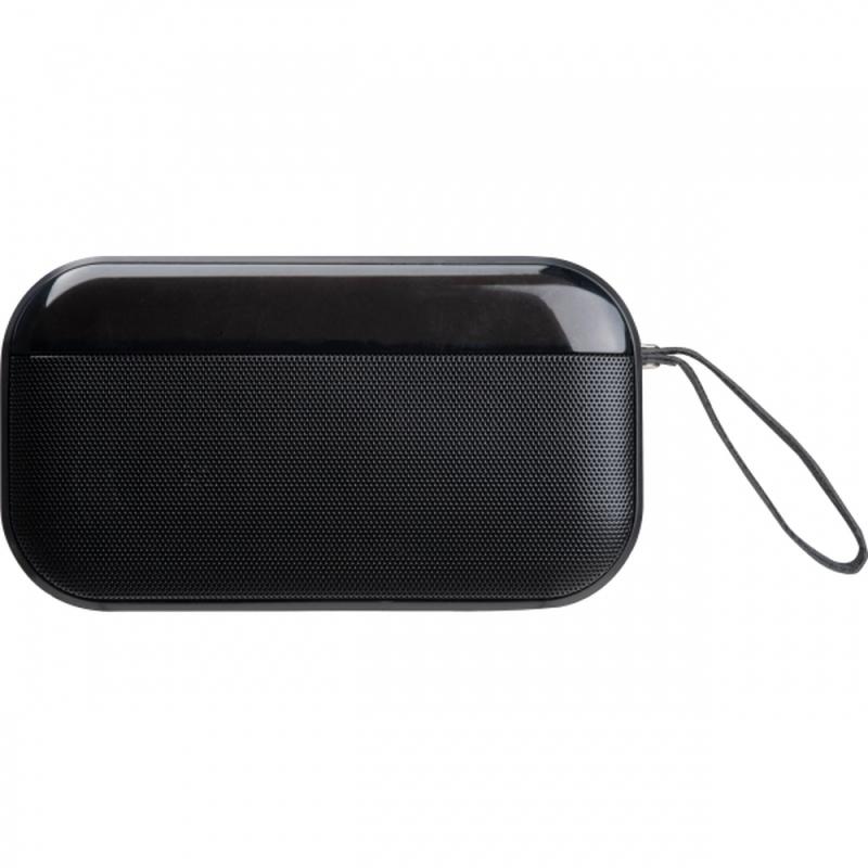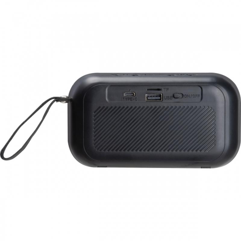 Prostokątny, bezprzewodowy głośnik bluetooth, z baterią o pojemności 800 mAh (5V), diodami LED i kabelkiem do ładowania. Głośnik posiada złącze USB typu C, slot na kartę SD oraz mały uchwyt do przenoszenia.