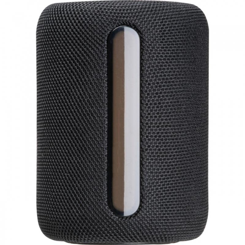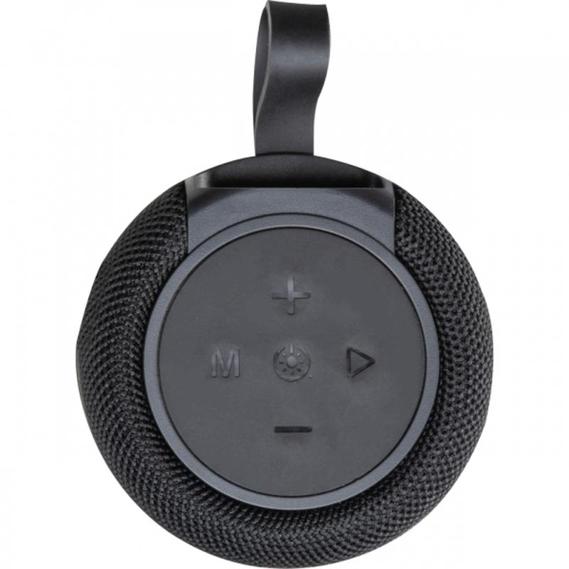 Okrągły, bezprzewodowy głośnik bluetooth, z baterią o pojemności 800 mAh (5V), diodami LED i kabelkiem do ładowania. Głośnik posiada złącze USB typu C, slot na kartę SD oraz mały uchwyt do przenoszenia.
