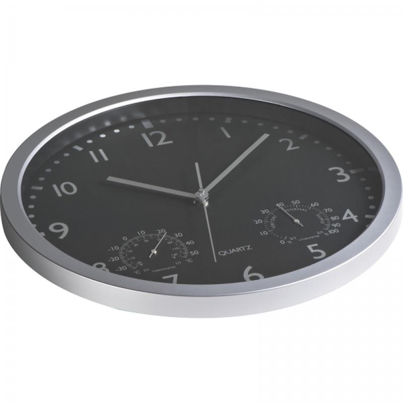 Elegancki zegar w wytrzymałej obudowie. Kontrastująca tarcza i duże cyfry. Dodatkowy wskaźnik temperatury i wilgotności powietrza. Brak baterii w zestawie.