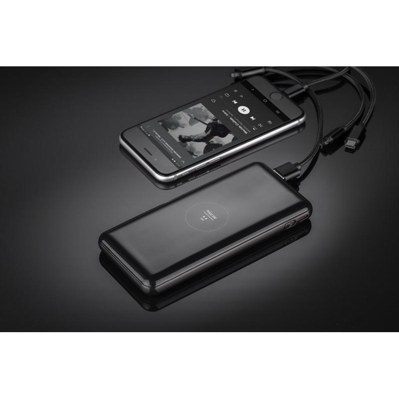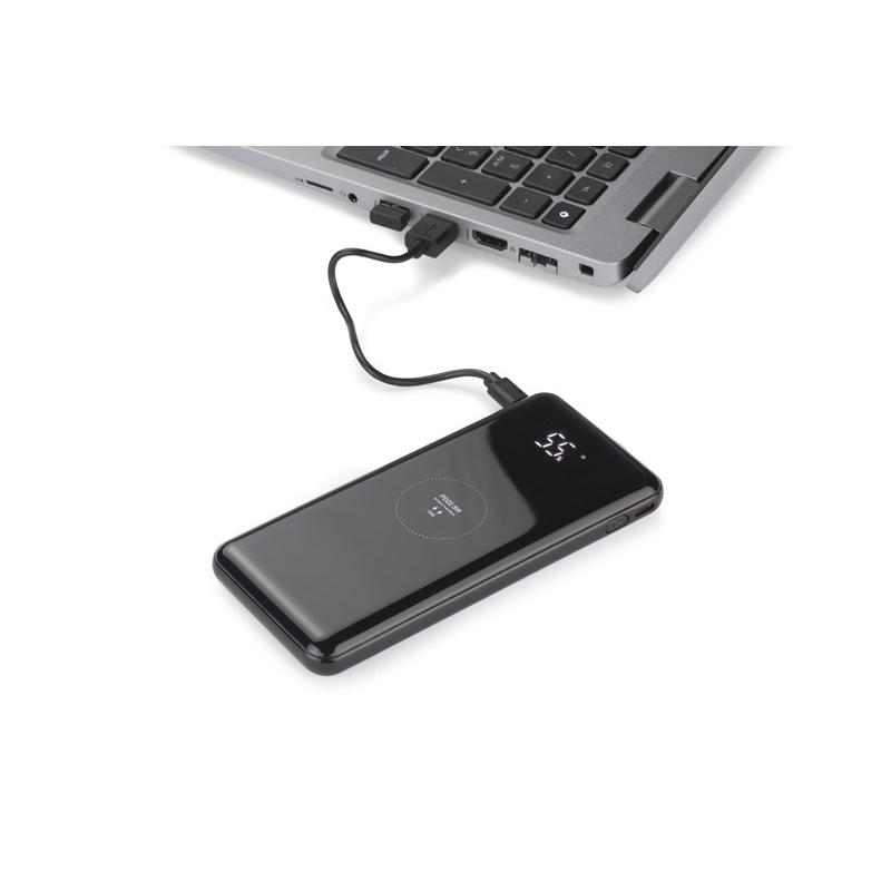 FUERTE 15W to power bank, który posiada wiele nowoczesnych funkcji. Najważniejszą z nich jest funkcja szybkiego ładowania Power Delivery (PD). Jest to standard szybkiego ładowania umożliwiający przesyłanie dużych mocy przez złącze typu USB-C. Technologia charakteryzuje się zwiększonym poziomem mocy, w przypadku FUERTE jest to aż 15W. Największą zaletą standardu Power Delivery jest możliwość inteligentnego dostosowywania mocy ładowania do ładowanego urządzenia. Poza tym power bank posiada wbudowaną ładowarkę bezprzewodową o maksymalnej mocy 15W, cyfrowy wyświetlacz ukryty pod elegancką lustrzaną obudową i latarkę. Port USB-C jest dwukierunkowy – jest jednocześnie wejściem i wyjściem, co oznacza, że - łącznie z dwoma wyjściami USB-A – istnieje możliwość ładowania aż trzech urządzeń jednocześnie. Kabel do ładowania jest dołączony.