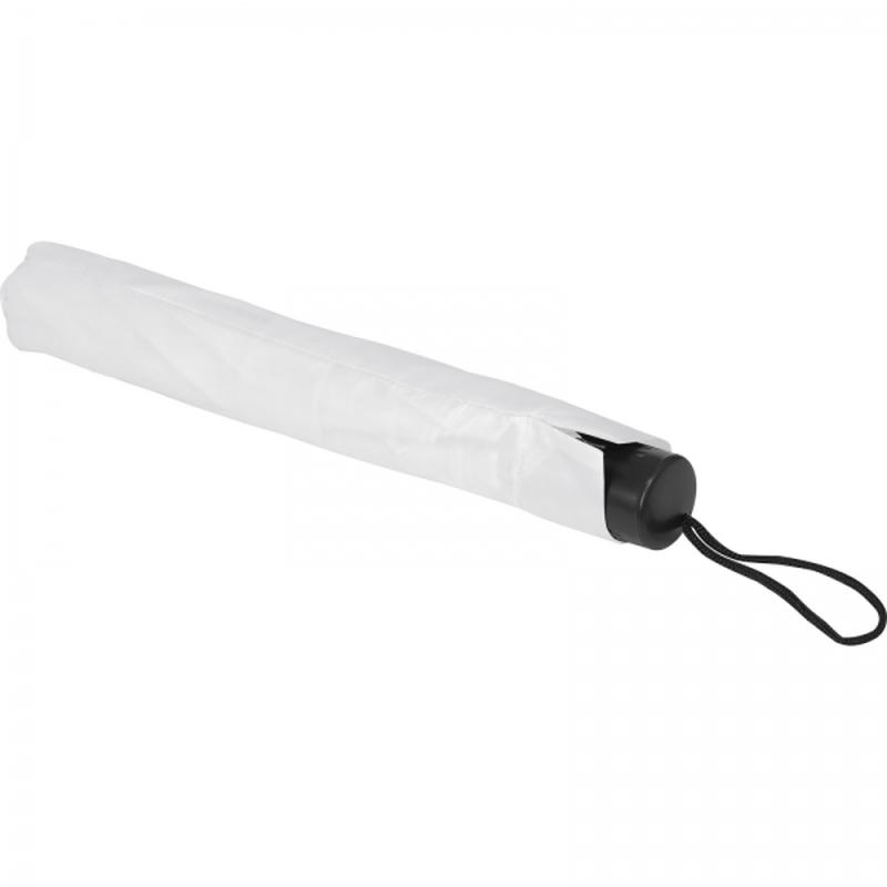 Ręcznie otwierany składany parasol kieszonkowy wykonany z poliestru, z elementami metalowymi i plastikowymi, z pokrowcem ochronnym.
