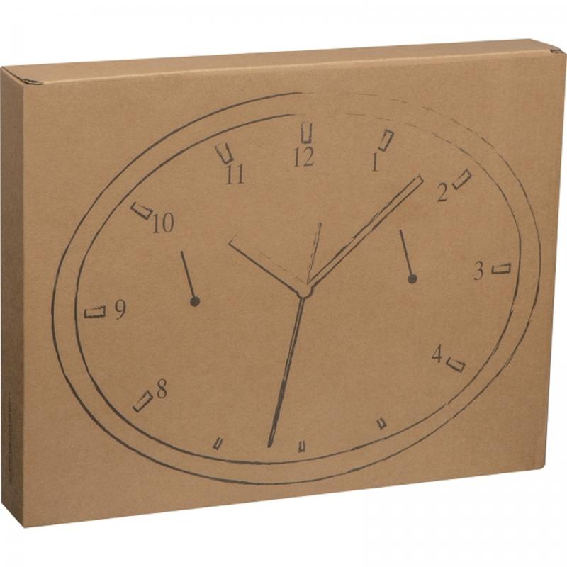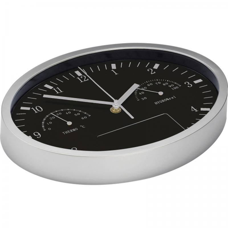Owalny zegar ścienny z termometrem i higrometrem. Logotyp można umieścić na specjalnym panelu.