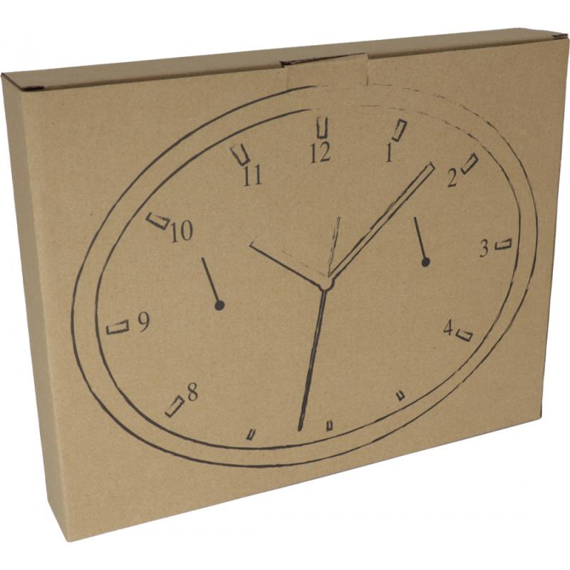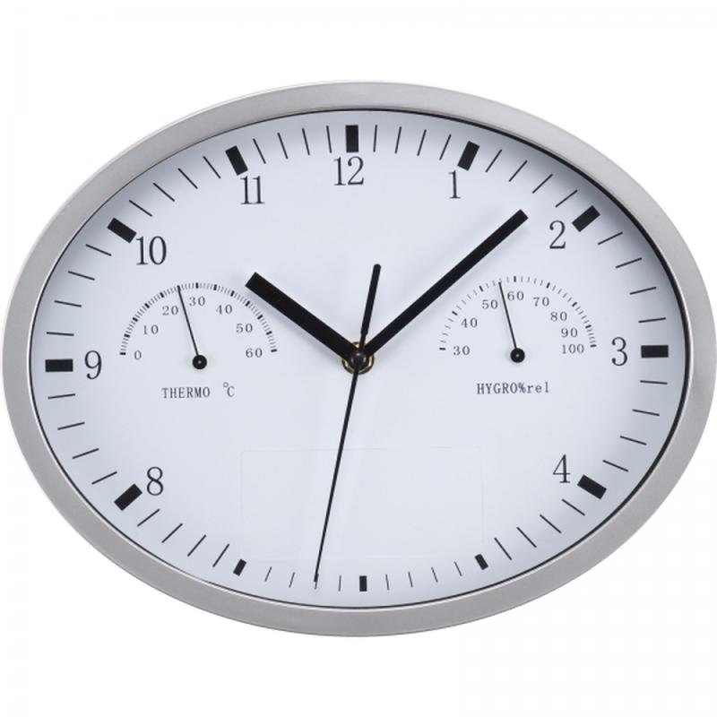 Owalny zegar ścienny z termometrem i higrometrem. Logotyp można umieścić na specjalnym panelu.