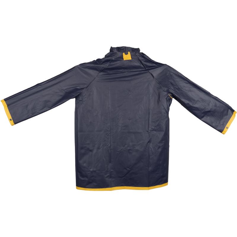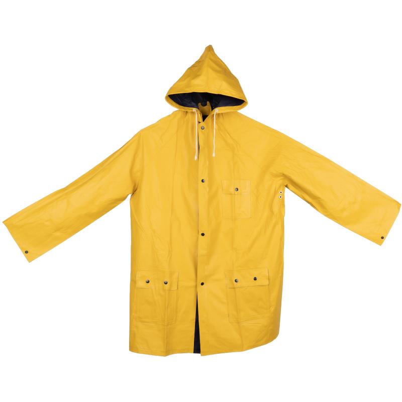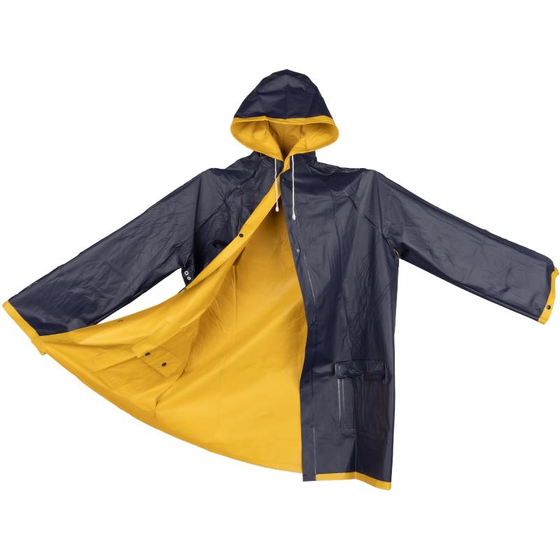 Dwukolorowa, dwustronna kurtka przeciwdeszczowa XL, z PVC (bez ftalanów), z zatrzaskami i kapturem. Wymiary pleców kurtki 103 x 60 cm.