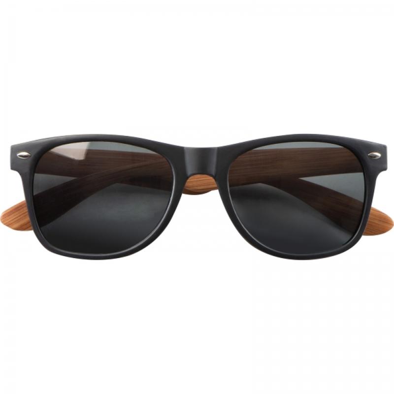 Okulary przeciwsłoneczne w czarnej oprawie, z mocnego plastiku o strukturze imitującej słoje drewna. Posiadają filtr 400 UV kategorii 3.