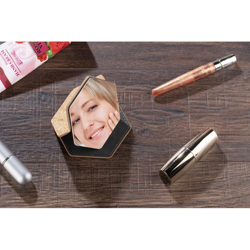 Odkryj kieszonkowe lusterko SARI. Korkowa obudowa w kształcie heksagonu nadaje lusterku nowoczesny, ekologiczny charakter, wyróżniając je spośród innych akcesoriów. SARI możesz postawić na płaskiej powierzchni i wygodnie poprawić makijaż czy wygląd, gdziekolwiek jesteś. Kompaktowy rozmiar sprawia, że lusterko SARI mieści się w każdej torebce.