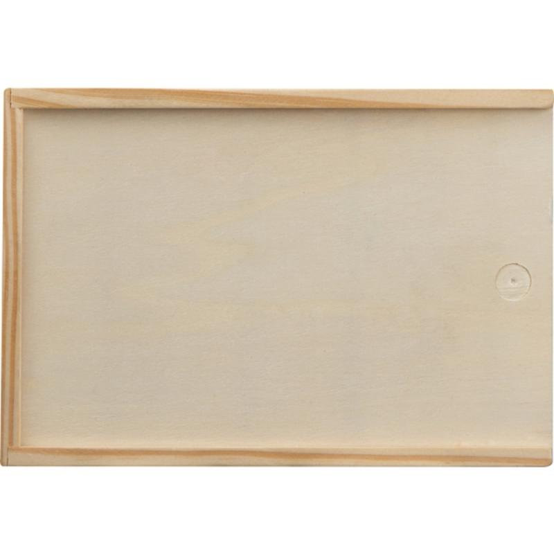 Dwie talie kart oraz zestaw kości do gry w drewnianym opakowaniu.
