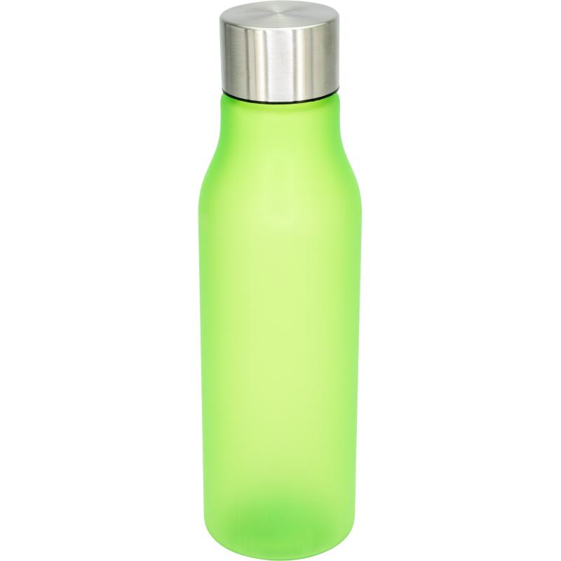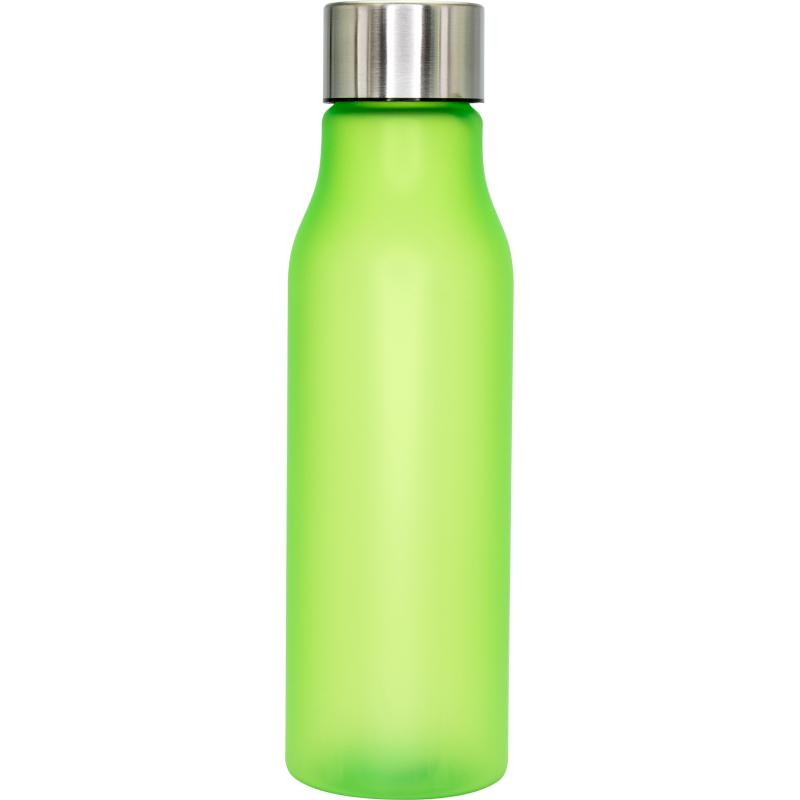 Butelka o pojemności 550 ml, wykonana z przyjemnego w dotyku plastiku z gumowym wykończeniem i metalową zakrętką.