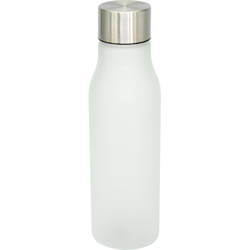 Butelka o pojemności 550 ml, wykonana z przyjemnego w dotyku plastiku z gumowym wykończeniem i metalową zakrętką.