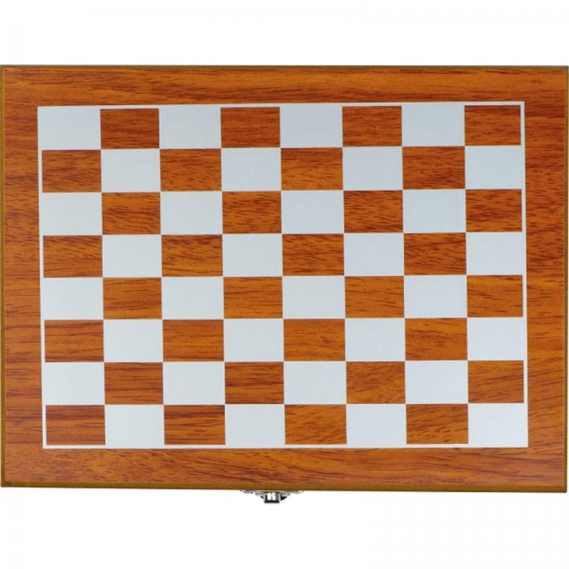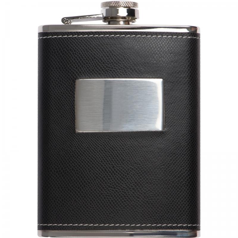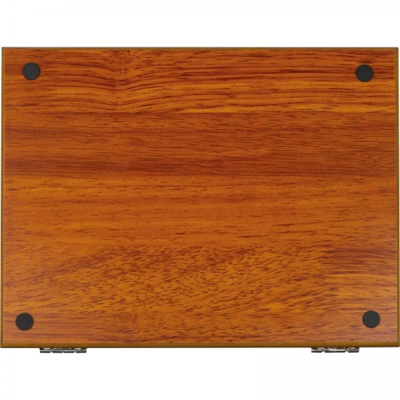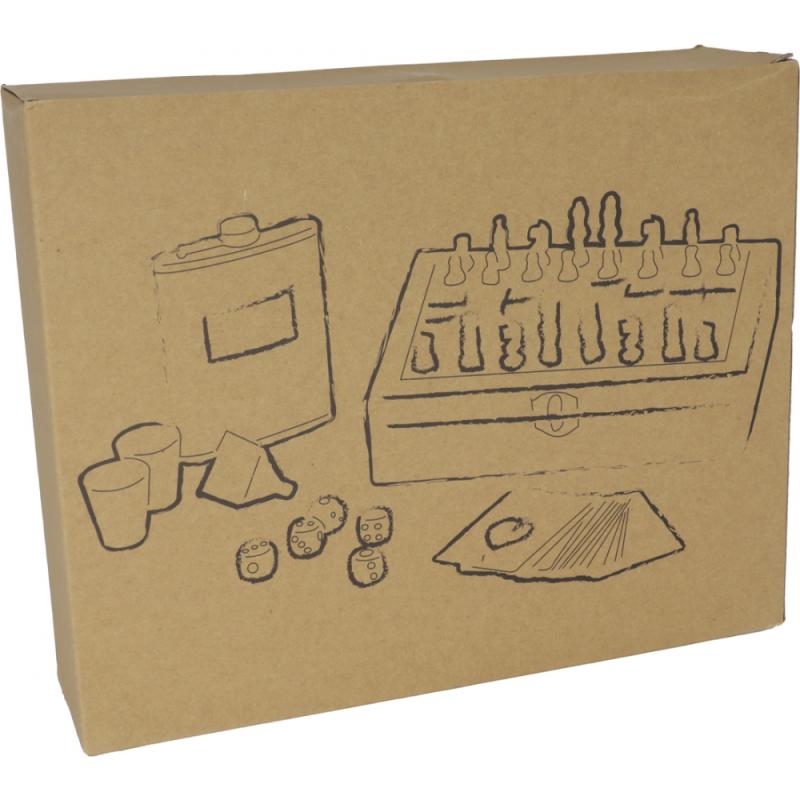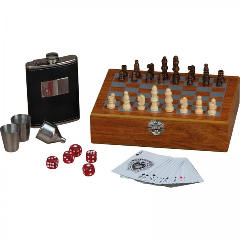 Zestaw składający się z metalowej piersiówki o pojemności 237ml, 2 kieliszków i lejka, a także szachów, kart oraz kości do gry. Całość zapakowana w drewniane pudełko.