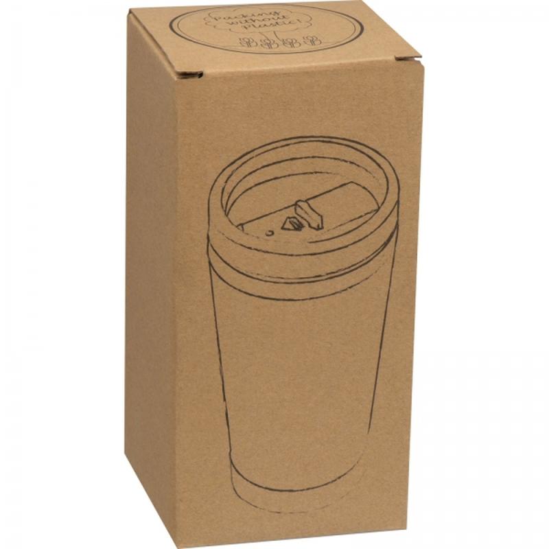 Bambusowy kubek. Wnętrze wykonane jest ze stali nierdzewnej, pokrywka z plastiku i metalu. Pojemność 400 ml.