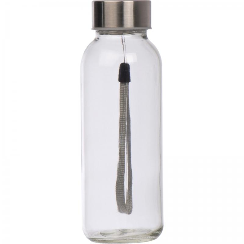 Szklana butelka z uchwytem do przenoszenia, zakrętką ze stali nierdzewnej, w neoprenowym pokrowcu. Pojemność 300 ml.