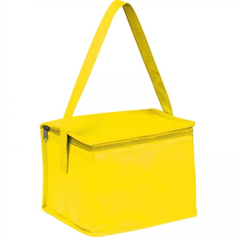 Torba chłodząca wykonana z materiału non-woven, zamykana na zamek, z paskiem. Pomieści 6 puszek (o pojemności 0,33 l).