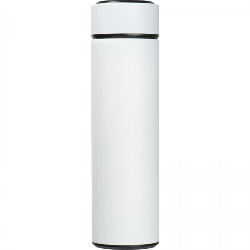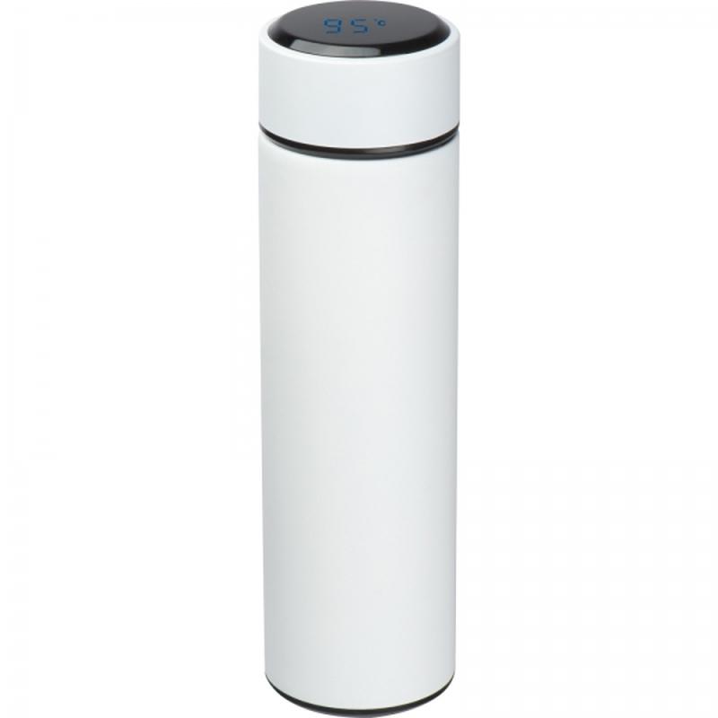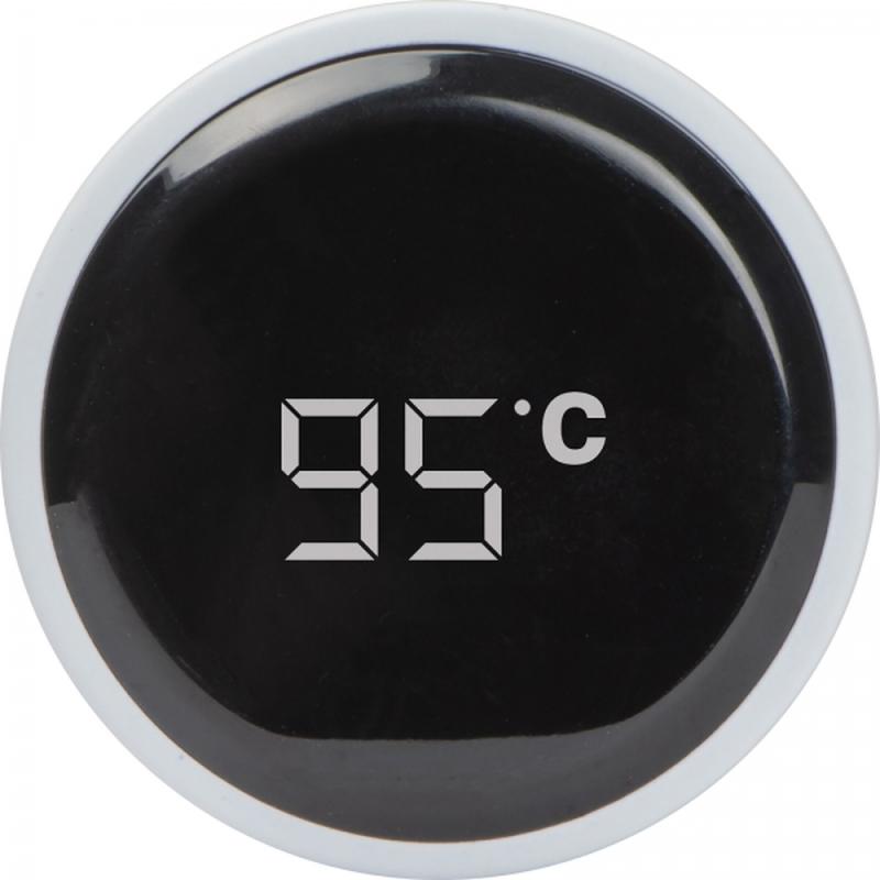 Termos ze stali nierdzewnej z elektronicznym termometrem w plastikowej pokrywce. Wystarczy go dotknąć, a temperatura napoju pokazuje się na wyświetlaczu. Termos utrzymuje ciepłą temperaturę napoju do 6 godzin, a zimną - do 9. Pojemność 450 ml.