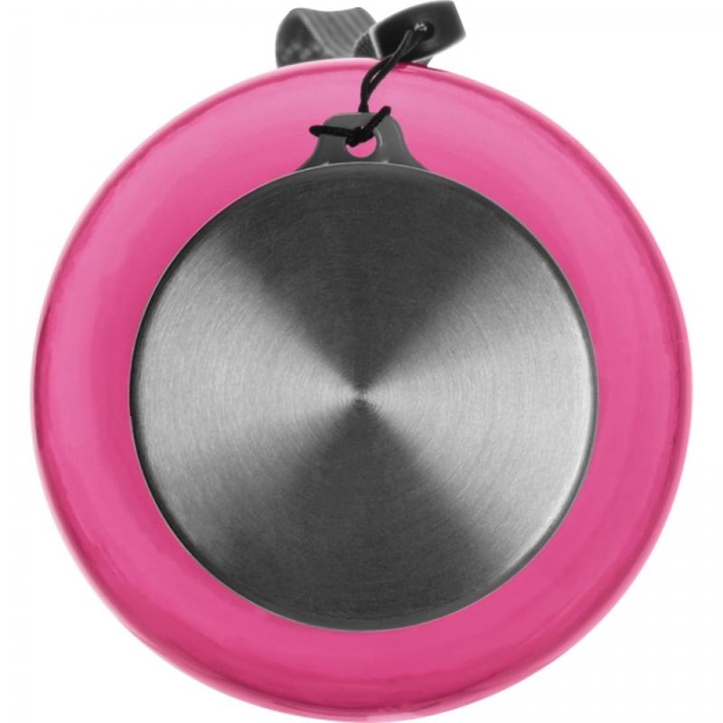 Butelka z materiału PET pochodzącego z recyklingu, posiada metalową nakrętkę z przymocowanym do niej sznureczkiem.