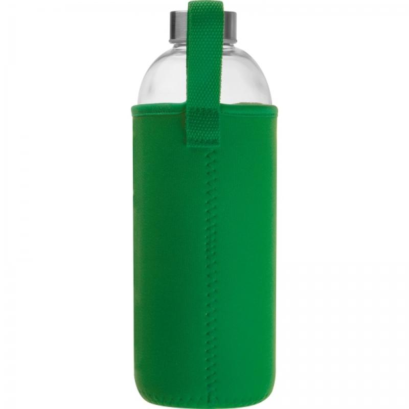 Szklana butelka o pojemności 1000 ml w neoprenowym etui, z zakrętką ze stali nierdzewnej.
