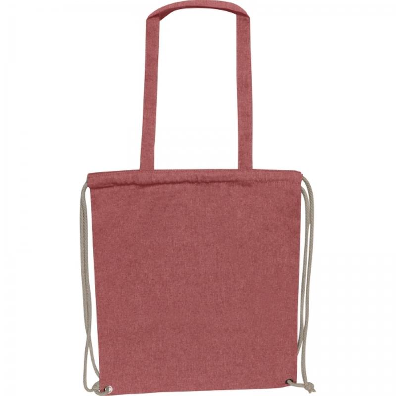 Bawełniana torba-worek z bawełny pochodzącej z recyklingu, z certyfikatem Oeko-Tex STANDARD 100, o gramaturze 140g/m². Torba posiada długie uchwyty do noszenia na ramieniu i sznurki do zamykania i noszenia na plecach.