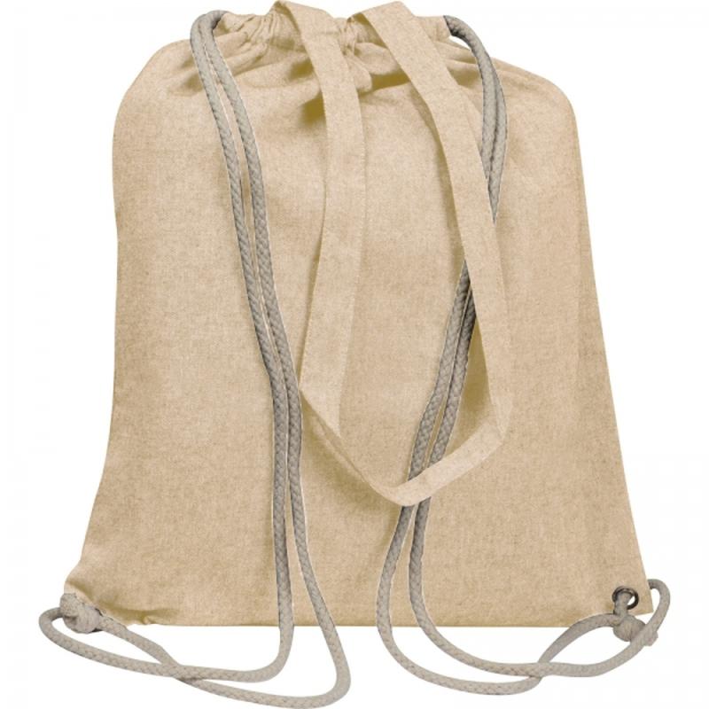 Bawełniana torba-worek z bawełny pochodzącej z recyklingu, z certyfikatem Oeko-Tex STANDARD 100, o gramaturze 140g/m². Torba posiada długie uchwyty do noszenia na ramieniu i sznurki do zamykania i noszenia na plecach.