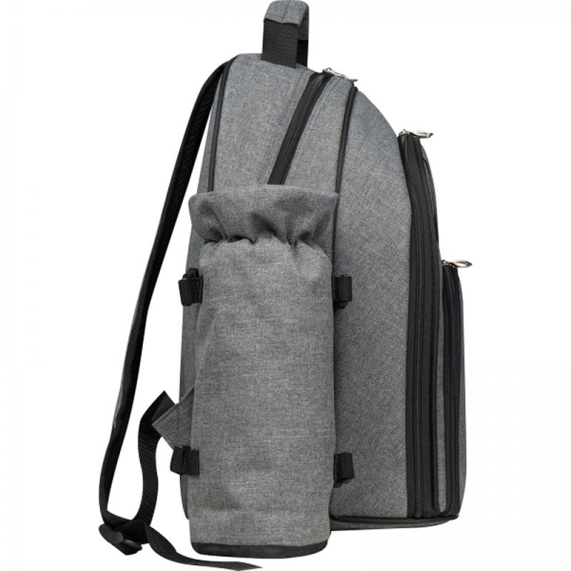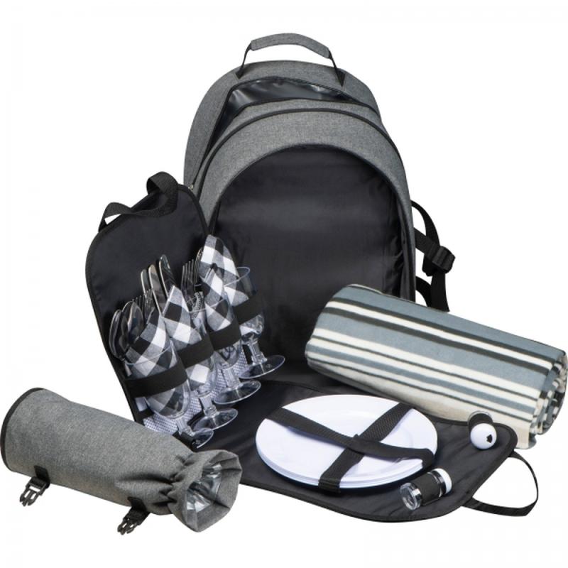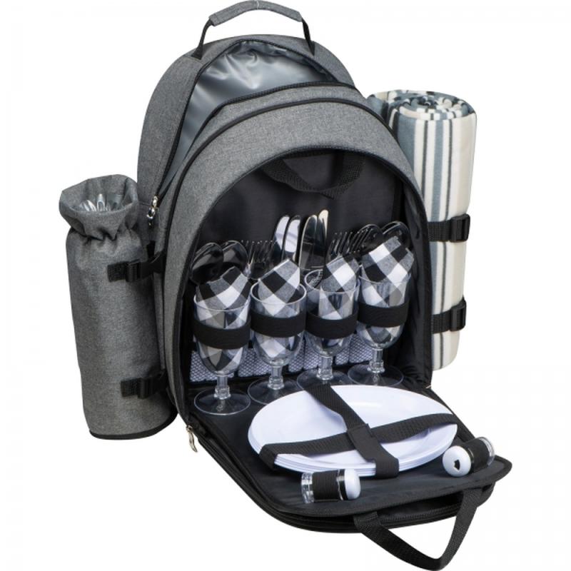 Plecak piknikowy wyposażony w zastawę składającą się z 4 talerzy, sztućców, solniczki i pieprzniczki. Z boków plecaka znajduje się kocyk piknikowy i uchwyt na butelkę z izolacją termiczną.