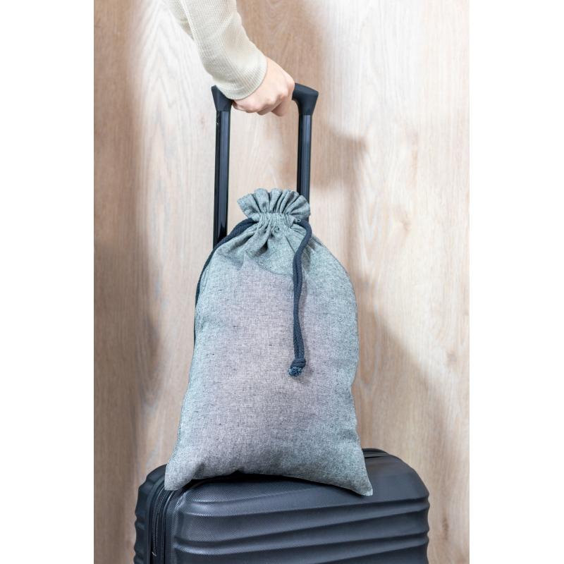 Duży woreczek bawełniany wykonany z bawełny pochodzącej z recyklingu, z certfikatem Oeko-Tex STANDARD 100, gramatura 110g/m². Woreczek zamykany za pomocą sznureczków ściągających.