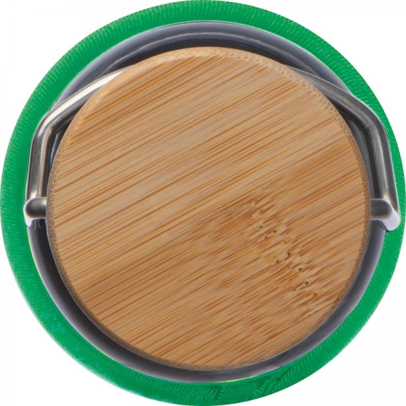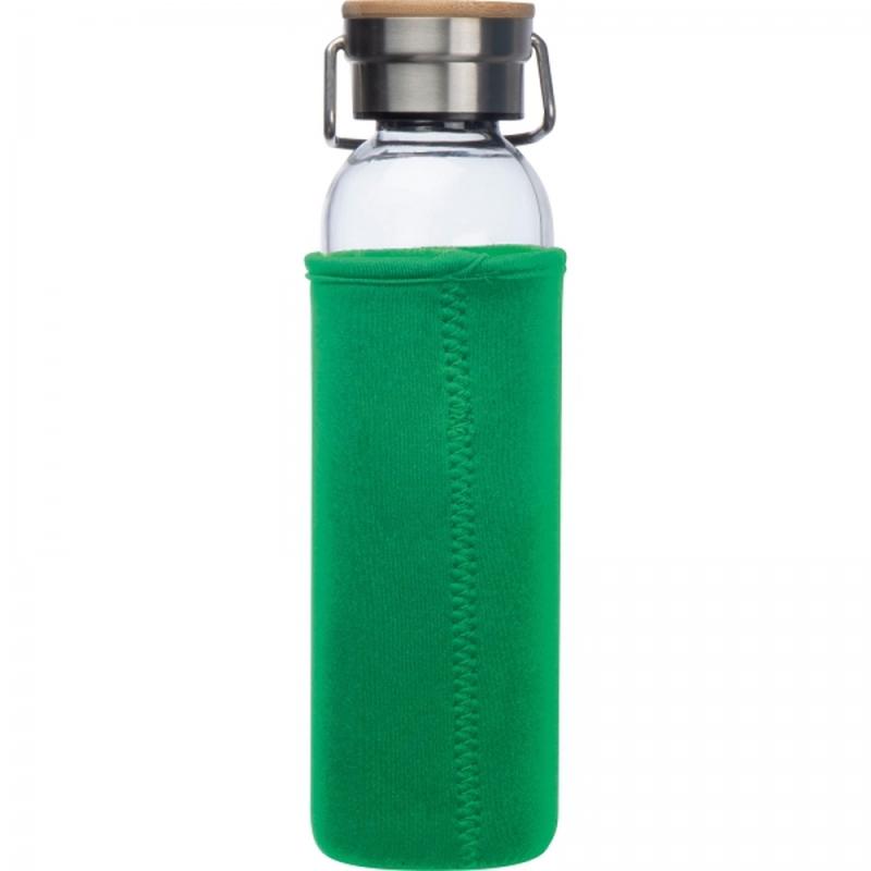 Szklana butelka o pojemności 600 ml, z pokrywką ze stali nierdzewnej i bambusowym zamknięciem. Butelkę przed uszkodzeniami chroni neopropanowe etui.