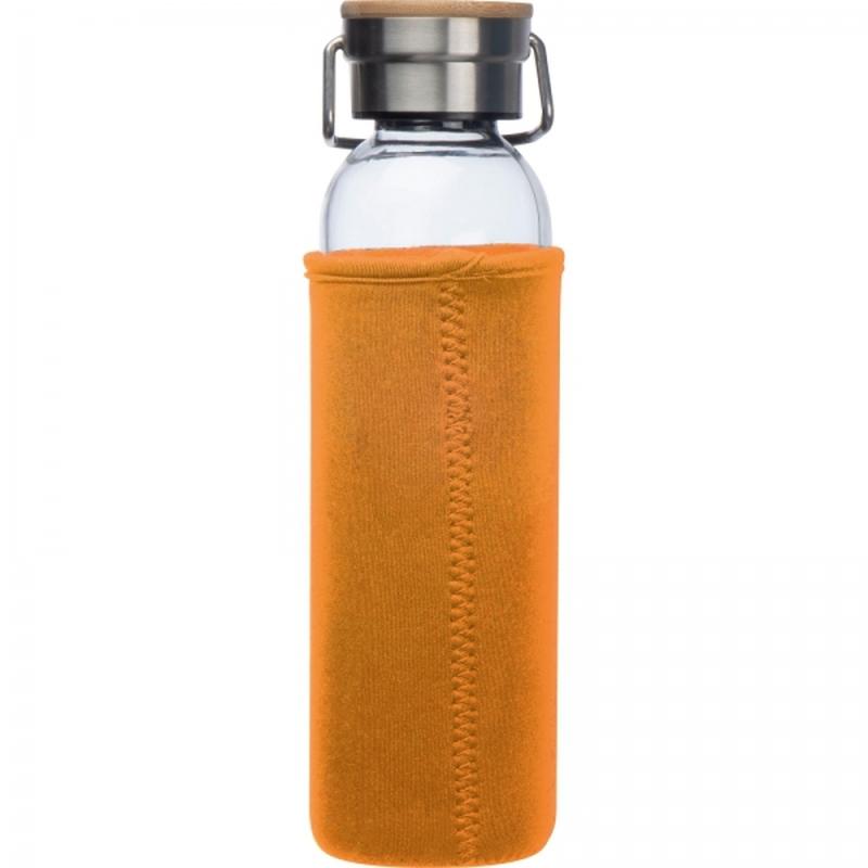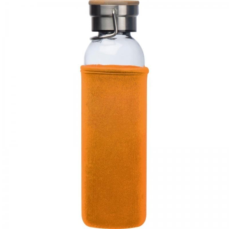 Szklana butelka o pojemności 600 ml, z pokrywką ze stali nierdzewnej i bambusowym zamknięciem. Butelkę przed uszkodzeniami chroni neopropanowe etui.