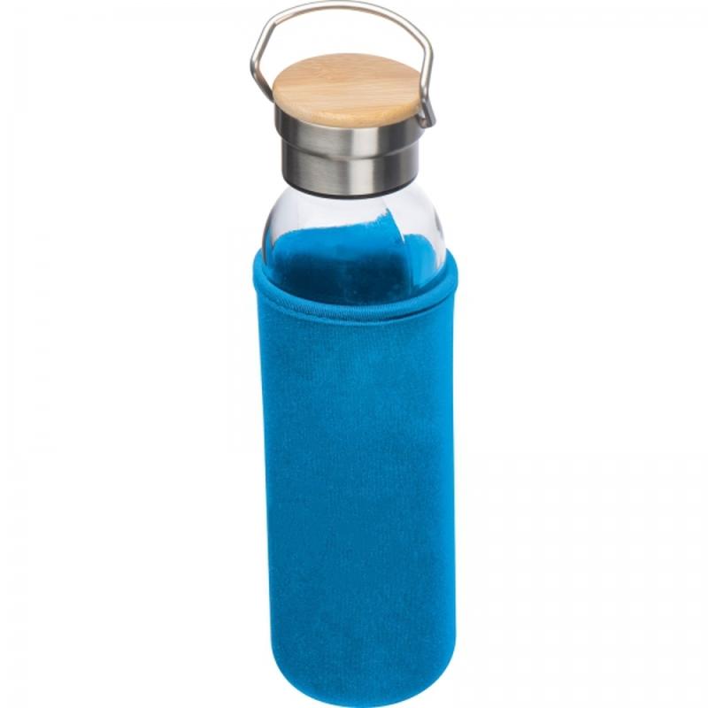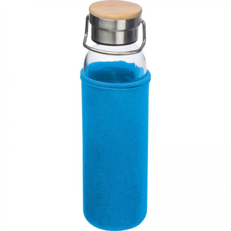 Szklana butelka o pojemności 600 ml, z pokrywką ze stali nierdzewnej i bambusowym zamknięciem. Butelkę przed uszkodzeniami chroni neopropanowe etui.