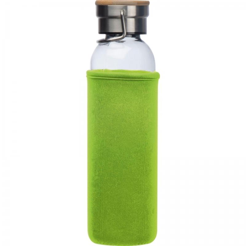 Szklana butelka o pojemności 600 ml, z pokrywką ze stali nierdzewnej i bambusowym zamknięciem. Butelkę przed uszkodzeniami chroni neopropanowe etui.