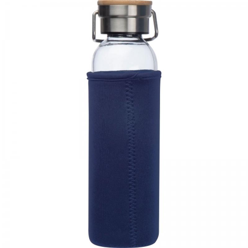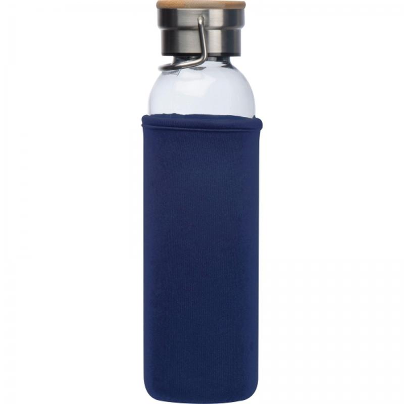 Szklana butelka o pojemności 600 ml, z pokrywką ze stali nierdzewnej i bambusowym zamknięciem. Butelkę przed uszkodzeniami chroni neopropanowe etui.