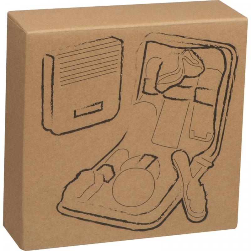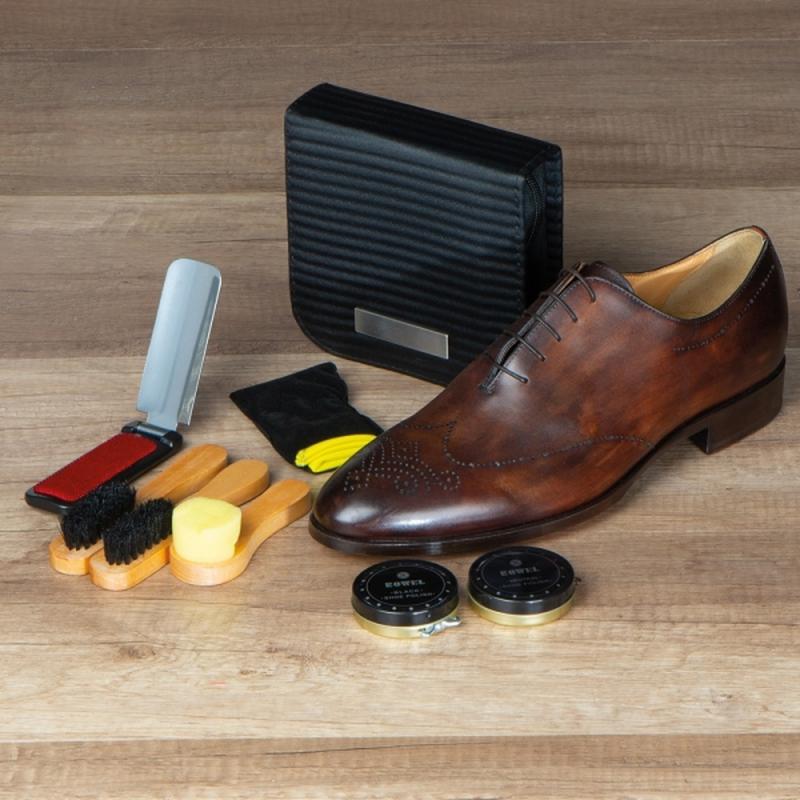 Zestaw do czyszczenia butów w etui z tworzywa sztucznego. W jego skład wchodzą dwie szczotki z drewnianym uchwytem i miękkim włosiem, metalowa łyżka do butów zintegrowana ze szczotką do ubrań, dwie pasty (czarna i bezbarwna) oraz gąbka i ściereczka.
