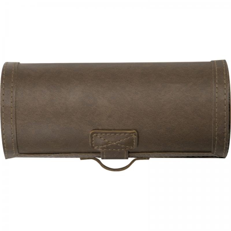 Zestaw do pielęgnacji obuwia w brązowym etui z ekologicznej skóry. Bezbarwna pasta, mała gąbka do czyszczenia, szczotka do obuwia, szmatka do polerowania oraz łyżka do butów.